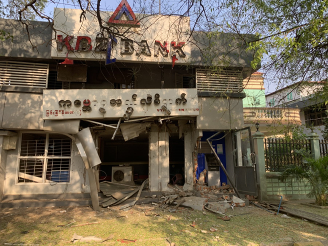 အလားတူ ဧပြီလ ၁၈ ရက်နေ့ နံနက် ၁ နာရီအချိန်တွင် မန္တလေးတိုင်းဒေသကြီး၊ တောင်သာ မြို့နယ်၊ အလယ်ချိုင့်ကျေးရွာ ရပ်ကွက်စီမံအုပ်ချုပ်ရေးအဖွဲ့မှူး ဦးစိန်ရွှေ၏ နေအိမ်အား အကြမ်း ဖက်သူလူအုပ်စုမှ မီးပုလင်းများဖြင့် ပစ်ပေါက်ထွက်ပြေးခဲ့ရာ အဆိုပါမီးပုလင်းများမှာ နေအိမ်အမိုး ပေါ်ကျရောက်ပေါက်ကွဲ မီးလောင်ခဲ့ပြီး ဝိုင်းဝန်းငြှိမ်းသတ်မှုကြောင့် နံနက် ၁ နာရီ ၁၀ မိနစ်အချိန် တွင် မီးငြိမ်းသွားခဲ့ပြီး မီးလောင်မှုကြောင့် နေအိမ်နောက်ဖေး အမိုးအနည်းငယ် မီးလောင်ပျက်စီးခဲ့ ကြောင်း သိရှိရသည်။ ထို့အတူ ယနေ့ညနေပိုင်းတွင် မန္တလေးတိုင်းဒေသကြီး၊ မြင်းခြံမြို့နယ်၊ အမှတ်(၁၃)ရပ်ကွက်၊ ဗိုလ်ချုပ်လမ်းရှိ မြင်းခြံ  KBZ mini Bank ၁ အား လက်လုပ်မိုင်းဖြင့် လာရောက် ပစ်ခတ်ခဲ့ခြင်းကြောင့် ဘဏ်ရှေ့ အလူမီနီယမ် လိပ်တံခါးဆိုင်းဘုတ်၊ အဝင်ဝ မျက်နှာ ကျက်၊ ATM စက်ခန်းမှန်တံခါး၊ အုတ်နံရံများ ပြိုကျပျက်စီး၊ မှန်တံခါးများ ကွဲအက်ခဲ့ကြောင်း သိရှိရ သည်။