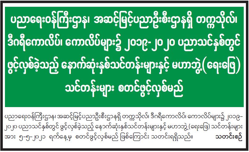 ပညာရေးဝန်ကြီးဌာန၊ အဆင့်မြင့်ပညာဦးစီးဌာနရှိ တက္ကသိုလ်၊ ဒီဂရီကောလိပ်၊ ကောလိပ်များ၌ ၂၀၁၉-၂၀၂၀ ပညာသင်နှစ်တွင် ဖွင့်လှစ်ခဲ့သည့် နောက်ဆုံးနှစ်သင်တန်းများနှင့် မဟာဘွဲ့ (ရေးဖြေ) သင်တန်းများ စတင်ဖွင့်လှစ်မည်