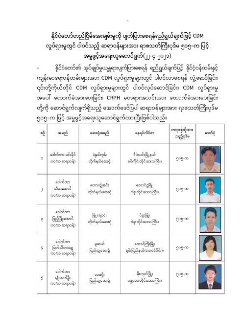 နိုင်ငံတော်တည်ငြိမ်အေးချမ်းမှုကို ပျက်ပြားစေရန်ရည်ရွယ်ချက်ဖြင့် CDM လှုပ်ရှားမှုတွင် ပါဝင်သည့် ဆရာဝန် များအား ရာဇသတ်ကြီးပုဒ်မ ၅၀၅-က ဖြင့် အမှုဖွင့်အရေးယူဆောင်ရွက် 04/23/2021