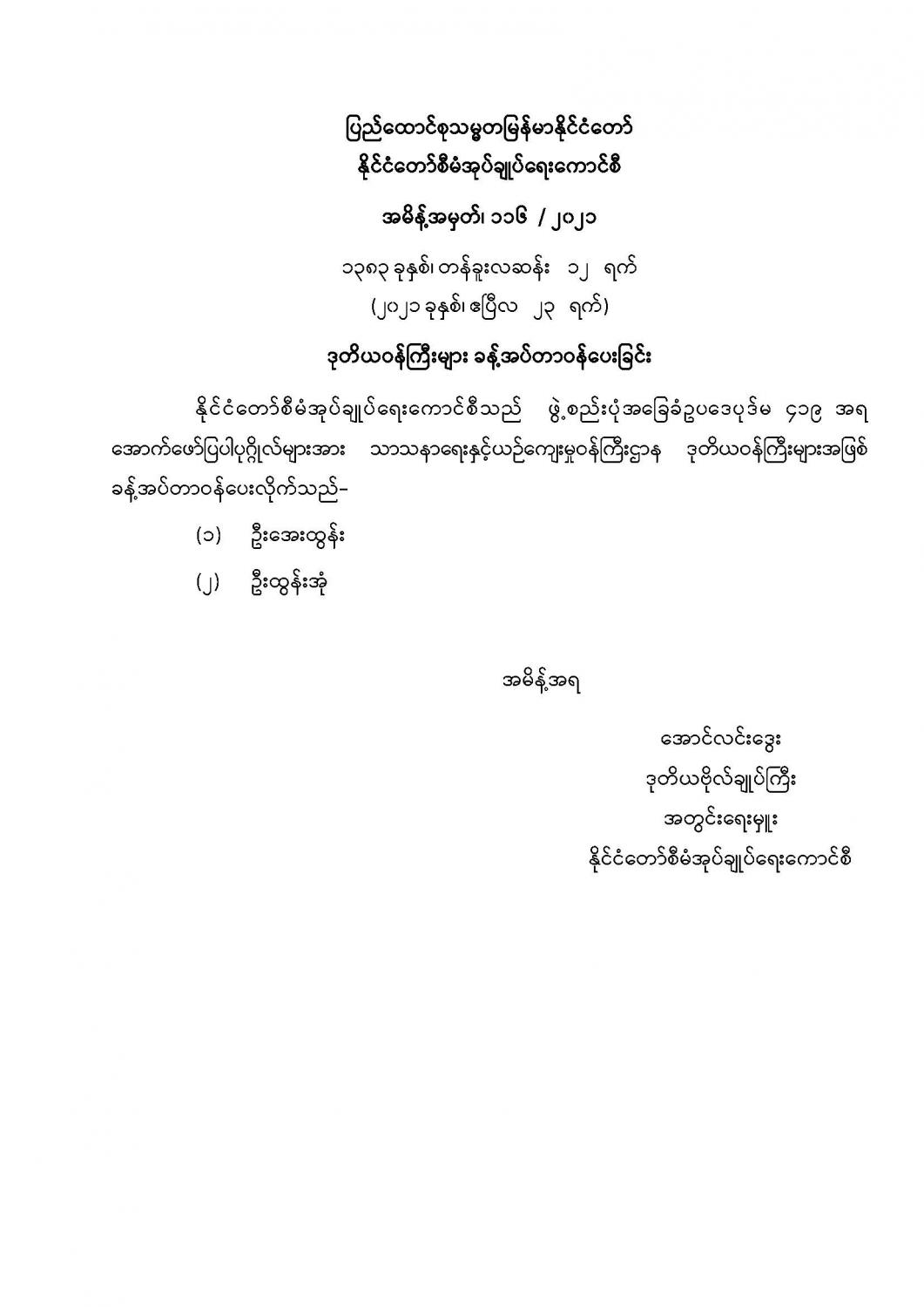 ဒုတိယဝန်ကြီးများ ခန့်အပ်တာဝန်ပေးခြင်း
