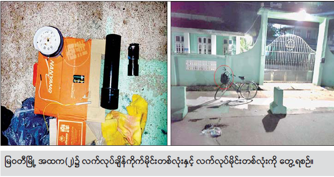 အလားတူ နံနက် ၇ နာရီတွင် လှိုင်မြို့နယ် အမှတ်(၈)ရပ်ကွက်ရှိ အမှတ်(၂) အခြေခံပညာ အထက်တန်းကျောင်းဝင်းအတွင်းရှိ ကျောင်းအုပ်ကြီး ရုံးရှေ့၌ မသင်္ကာဖွယ်ကြွပ်ကြွပ်အိတ်အထုပ် တစ်ထုပ်တွေ့ရှိကြောင်း သတင်းအရ လုံခြုံရေးတပ်ဖွဲ့ဝင်များက သွားရောက်စစ်ဆေးခဲ့ရာ အဆိုပါ ကြွပ်ကြွပ်အိတ်အတွင်းမှ Keypad ဖုန်းဖြင့် ချိတ်ဆက်ပြီး ကော်ပိုက်ဖြင့် ပြုလုပ်ထားသည့် လက်လုပ်မိုင်းတစ်လုံးကို တွေ့ရှိရသဖြင့် သက်မဲ့ ပြုလုပ်သိမ်းဆည်းခဲ့ကြောင်း သိရသည်။