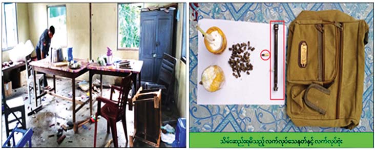 ထိုသို့ဆောင်ရွက်လျက်ရှိရာ ယနေ့ ညနေ ၅ နာရီအချိန်တွင် မန္တလေးတိုင်းဒေသကြီး၊ အမရပူရ မြို့နယ်၊ ဟင်္သာရပ်ကွက်၊ ရပ်ကွက်စီမံအုပ်ချုပ်ရေးအဖွဲ့ရုံး၌ ရပ်ကွက်အုပ်ချုပ်ရေး တာဝန်ရှိသူများ အစည်းအဝေး ပြုလုပ်နေစဉ် ဆိုင်ကယ်စီးနင်းလာသည့် အကြမ်းဖက်သူအမျိုးသား ၂ ဦးက လက်လုပ်မိုင်းတစ်လုံးဖြင့် ပစ်ပေါက်ထွက်ပြေးသွားခဲ့ရာ အဆိုပါ ၂ ဦးအနက်မှ ဘိုညီလေး (ခ) ညီလေး (၃၅)နှစ် (ဘ) ဦးတင်အောင် အား ဖမ်းဆီးရမိခဲ့ပြီး ၎င်းထံမှ  လက်လုပ်မိုင်း ၂ လုံး၊ လက်လုပ်သေနတ်အသေး ၁ လက်တို့အား သိမ်းဆည်းရမိခဲ့ကြောင်းနှင့် လက်လုပ်မိုင်းပေါက်ကွဲမှု ကြောင့် ရပ်ကွပ်စီမံအုပ်ချုပ်ရေးအဖွဲ့ရုံးအတွင်းရှိ ပရိဘောဂပစ္စည်းအချို့ ကျိုးပဲ့ပျက်စီးဆုံးရှုံး ခဲ့ကြောင်း သိရသည်။