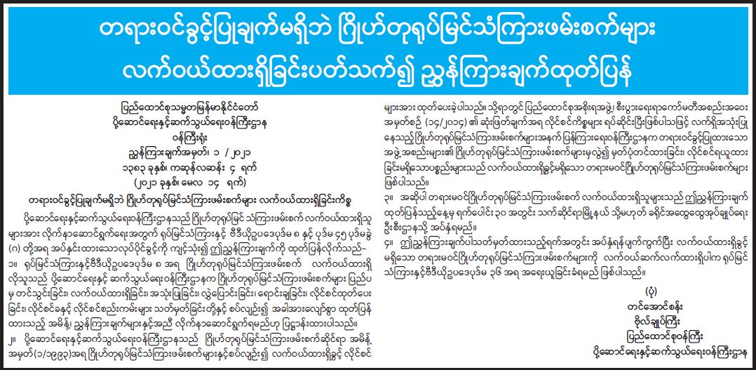 တရားဝင်ခွင့်ပြုချက်မရှိဘဲ ဂြိုလ်တုရုပ်မြင်သံကြားဖမ်းစက်များ လက်ဝယ်ထားရှိခြင်းနှင့်ပတ်သတ်၍ ညွှန်ကြားချက်ထုတ်ပြန် 05/18/2021