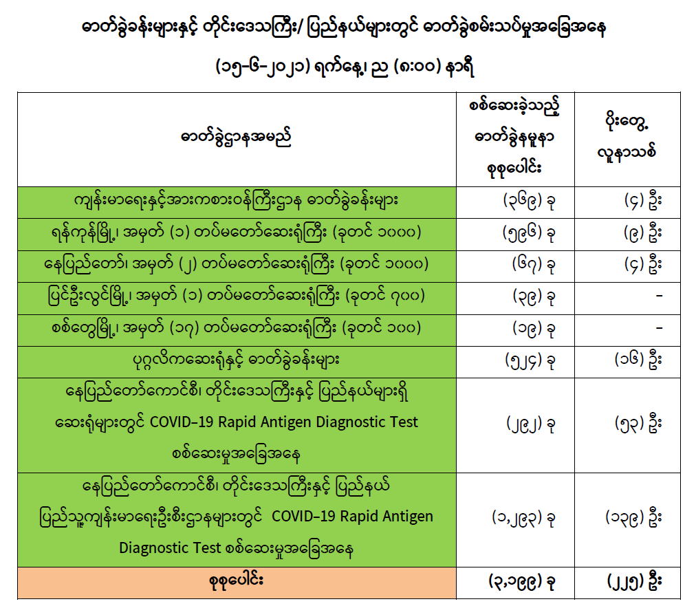 (၁၄-၆-၂၀၂၁) ရက်နေ့၊ ည (၈:၀၀) နာရီမှ (၁၅-၆-၂၀၂၁) ရက်နေ့၊ ည (၈:၀၀) နာရီအတွင်း ဓာတ်ခွဲနမူနာစုစုပေါင်း (၃,၁၉၉) ခုအား စစ်ဆေးပြီးစီးခဲ့ရာ COVID-19 ရောဂါ ဓာတ်ခွဲအတည်ပြု လူနာသစ် (၂၂၅) ဦး တွေ့ရှိရပါသည်။ သို့ဖြစ်ပါ၍ ယနေ့အထိ ဓာတ်ခွဲနမူနာ စုစုပေါင်း (၂,၆၅၄,၂၅၂) ခု အား စစ်ဆေးခဲ့ပြီး COVID-19 ဓာတ်ခွဲအတည်ပြုလူနာ စုစုပေါင်း (၁၄၆,၀၅၁) ဦး ရှိပြီ ဖြစ်ပါသည်။