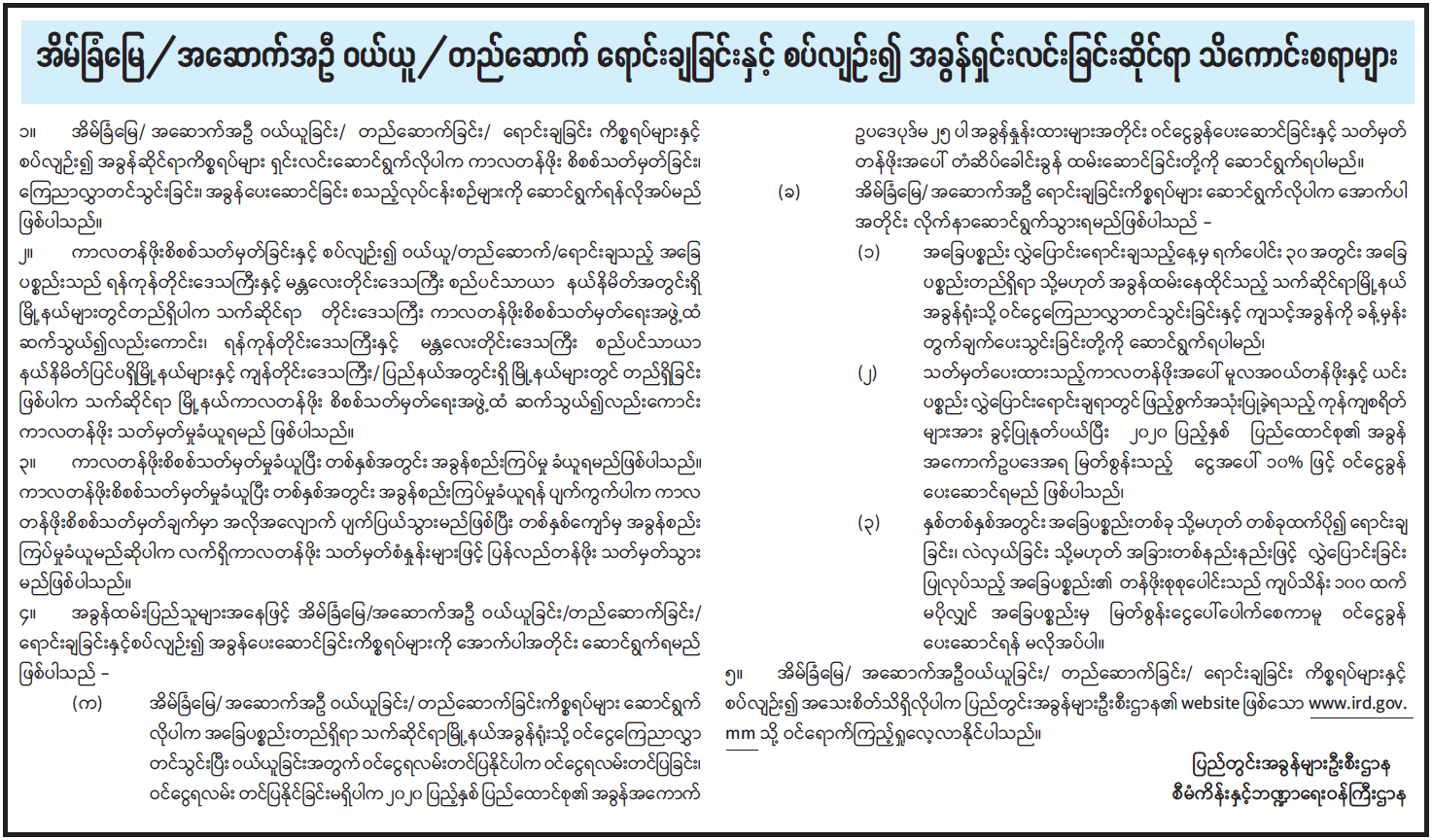 အိမ်ခြံမြေ/ အဆောက်အဦ ဝယ်ယူ/တည်ဆောက် ရောင်းချခြင်းနှင့် စပ်လျဉ်း၍ အခွန်ရှင်းလင်းခြင်းဆိုင်ရာ သိကောင်းစရာများ