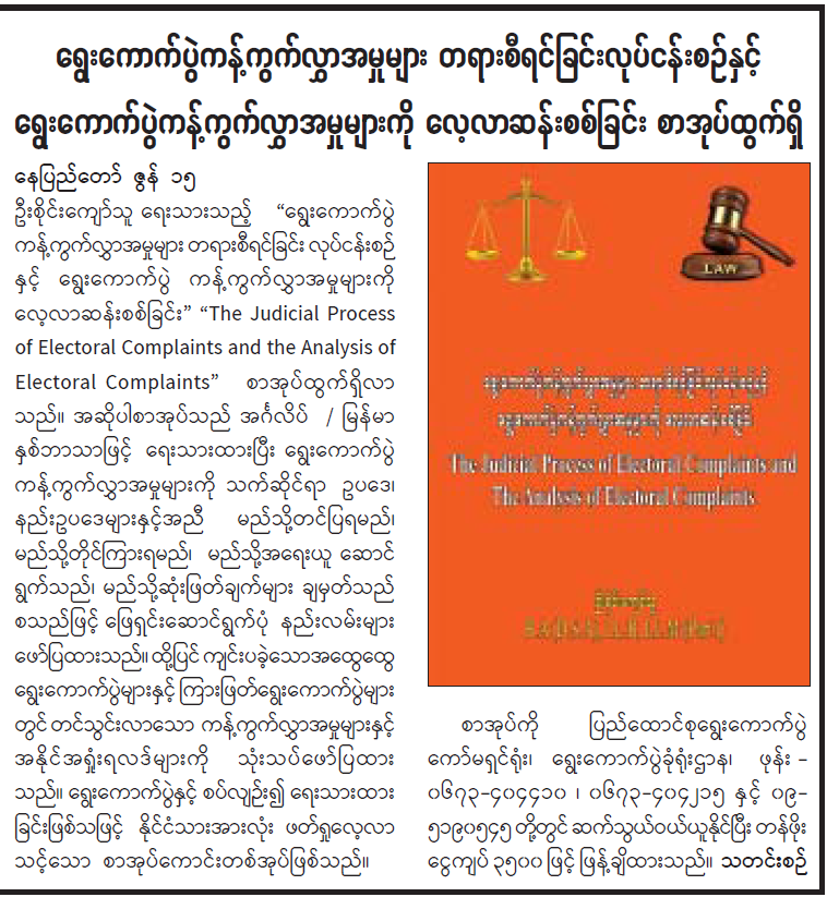 ရွေးကောက်ပွဲကန့်ကွက်လွှာအမှုများ တရားစီရင်ခြင်းလုပ်ငန်းစဉ်နှင့် ရွေးကောက်ပွဲကန့်ကွက်လွှာ အမှုများကို လေ့လာဆန်းစစ်ခြင်း စာအုပ်ထွက်ရှိ