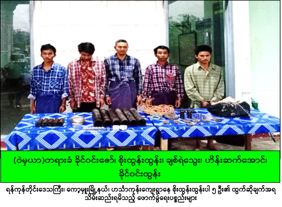 နေပြည်တော်၊ ဇွန် ၁၇ မြို့နယ်အချို့၌ အကြမ်းဖက်မှုလုပ်ရပ်များတွင် အသုံးပြုမည့် လက်နက်၊ ပစ္စည်း၊ ကိရိယာ များနှင့် သိုဝှက်သိမ်းဆည်းထားရှိသူများအား ဆက်လက်ဖော်ထုတ်ဖမ်းဆီးရမိခဲ့ကြောင်း သိရသည်။ ထိုသို့ဖမ်းဆီးခြင်းများ ဆောင်ရွက်ခဲ့ရာ ဇွန်လ ၁၆ ရက်နေ့ နံနက် ၁၂ နာရီအချိန်တွင် စစ်ကိုင်းတိုင်းဒေသကြီး၊ ဟုမ္မလင်းမြို့၊ နောင်ပကျစ်ရပ်ကွက်ရှိ သာသနာ့မဏ္ဍိုင်ဂန္ဓမာရုံကျောင်း တိုက်၌ အကြမ်းဖက်မှုလုပ်ရပ်များတွင် အသုံးပြုသည့်ပစ္စည်းများ သိုဝှက်ထားကြောင်း သတင်းအရ လုံခြုံရေးတပ်ဖွဲ့ဝင်များက သွားရောက်စစ်ဆေးခဲ့ရာ အဆိုပါဘုန်းကြီးကျောင်းအတွင်းမှ လက်လုပ် ဂက်(စ်)သေနတ် ၂ လက်၊ လက်လုပ်မိုင်း အထုပ် ၃ ထုပ်နှင့် အကြမ်းဖက်တိုက်ခိုက်ရာတွင် အသုံးပြုသော ပစ္စည်းများအား တွေ့ရှိသိမ်းဆည်းရရှိခဲ့ကြောင်း သိရသည်။ အလားတူ မွန်းလွဲ ၄ နာရီအချိန်တွင် ရန်ကုန်တိုင်းဒေသကြီး၊ ကော့မှူးမြို့နယ်အတွင်း ပေါက်ကွဲမှုဖြစ်စဉ်များနှင့် ဆက်စပ်၍ ဖမ်းဆီးစစ်ဆေးလျက်ရှိသော ဟင်္သာကုန်းကျေးရွာနေ စိုးထွန်းထွန်း (၅၀)နှစ် (ဘ)ဦးမြင့်စိုးပါ ၅ ဦး၏ ထွက်ဆိုချက်အရ လုံခြုံရေးတပ်ဖွဲ့ဝင်များသည် စိုးထွန်းထွန်း၏ နေအိမ်အား သွားရောက်ရှာဖွေခဲ့ရာ ၎င်း၏နေအိမ်ခြံဝင်းအတွင်းမှ သံပိုက်ဖြင့်ပြုလုပ် ထားသော လက်လုပ်မိုင်း ၅ လုံးနှင့် အကြမ်းဖက်တိုက်ခိုက်ရာတွင် အသုံးပြုသော ပစ္စည်းများအား တွေ့ရှိသိမ်းဆည်းရရှိခဲ့ကြောင်း သိရသည်။ အထက်ပါဖြစ်စဉ်များမှ အကြမ်းဖက်ရာတွင် အသုံးပြုမည့် လက်နက်၊ ပစ္စည်း၊ ကိရိယာ များအား သိုဝှက်သိမ်းဆည်းထားရှိသူများနှင့် လက်ဝယ်ထားရှိသူအား ဥပဒေနှင့်အညီ အရေးယူ ဆောင်ရွက်သွားမည်ဖြစ်ကြောင်း သိရှိရပါသည်။ သတင်းစဉ်