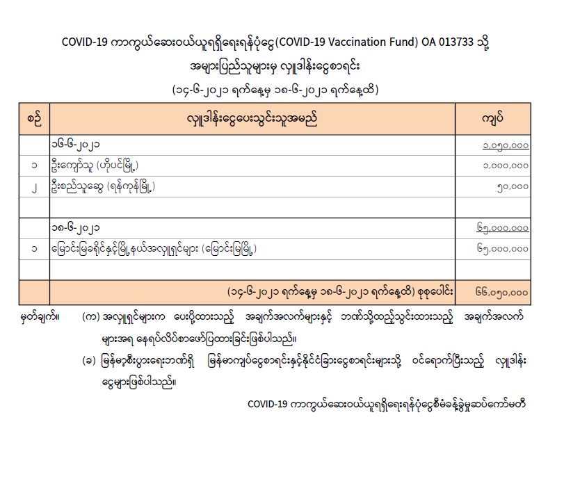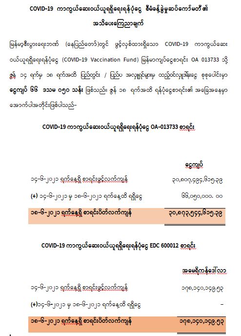 COVID-19 ကာကွယ်ဆေးဝယ်ယူရရှိရေးရန်ပုံငွေ စီမံခန့်ခွဲမှုဆပ်ကော်မတီ၏ အသိပေးကြေညာချက်