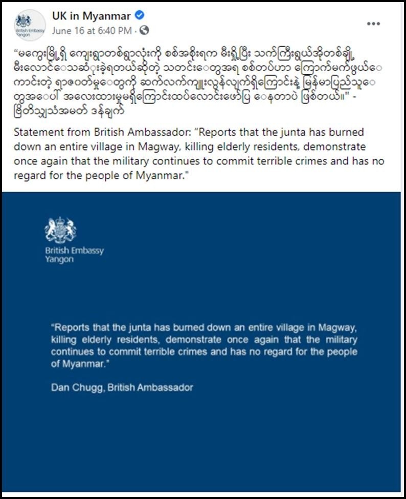 သို့ဖြစ်၍ NLD အမာခံများပါဝင်သည့် အကြမ်းဖက် PDF အဖွဲ့အနေဖြင့် အကြမ်းဖက် NUG ၏ ကြိုးကိုင်မှုဖြင့် ကမ္ဘာကုလသမဂ္ဂတွင် ဇွန် ၁၈ ရက်တွင် ကျင်းပပြုလုပ်ခဲ့သည့် ကုလသမဂ္ဂ အထွေထွေညီလာခံကျင်းပချိန်၊ ကုလသမဂ္ဂ လုံခြုံရေးကောင်စီ၏ တံခါးပိတ်အစည်းအဝေး ကျင်းပချိန်တို့နှင့် အချိန်ကိုက်၍ နိုင်ငံတော်အစိုးရပုံရိပ်ကို ထိခိုက်ရန်နှင့် နိုင်ငံတကာ၏ ဖိအားပေးမှု ဖြစ်ပေါ်စေရန် အကြံဖြင့် အပြစ်မဲ့ကျေးရွာများအား မီးရှို့အကြမ်းဖက်နေသကဲ့သို့ ထင်မြင်လာ စေရန် ပြုလုပ်ခြင်းဖြစ်သည်။