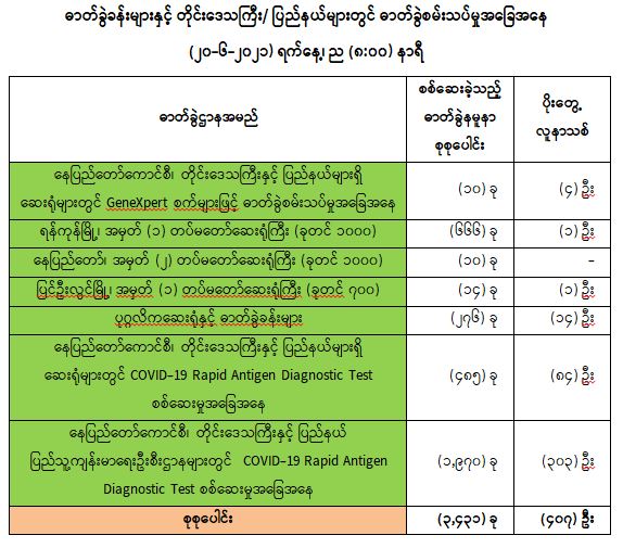 (၁၉-၆-၂၀၂၁) ရက်နေ့၊ ည (၈:၀၀) နာရီမှ (၂၀-၆-၂၀၂၁) ရက်နေ့၊ ည (၈:၀၀) နာရီအတွင်း ဓာတ်ခွဲနမူနာစုစုပေါင်း (၃,၄၃၁) ခုအား စစ်ဆေးပြီးစီးခဲ့ရာ COVID-19 ရောဂါ ဓာတ်ခွဲအတည်ပြု လူနာသစ် (၄၀၇) ဦး တွေ့ရှိရပါသည်။ သို့ဖြစ်ပါ၍ ယနေ့အထိ ဓာတ်ခွဲနမူနာ စုစုပေါင်း (၂,၆၇၄,၇၀၂) ခု အား စစ်ဆေးခဲ့ပြီး COVID-19 ဓာတ်ခွဲအတည်ပြုလူနာ စုစုပေါင်း (၁၄၈,၀၂၂) ဦး ရှိပြီ ဖြစ်ပါသည်။