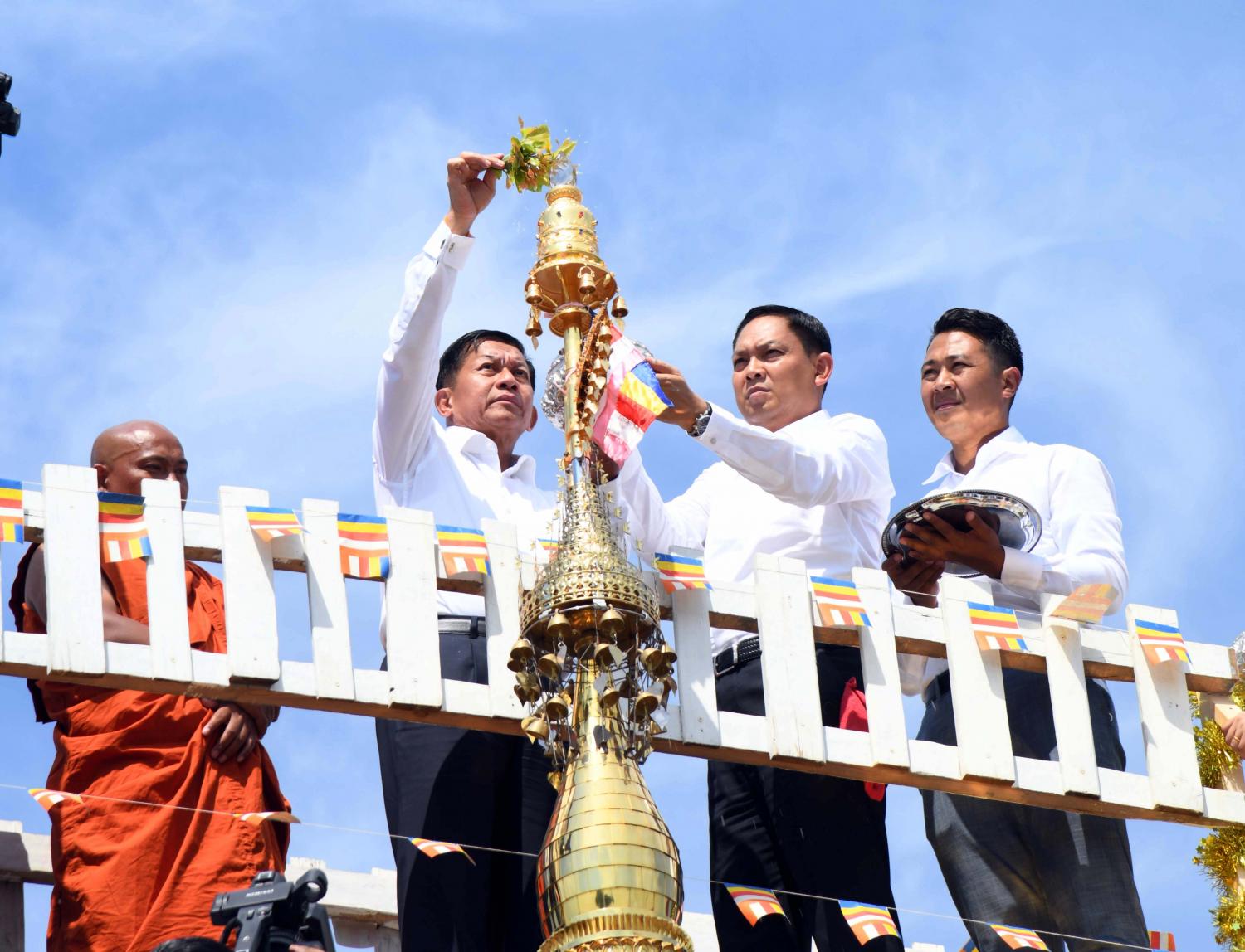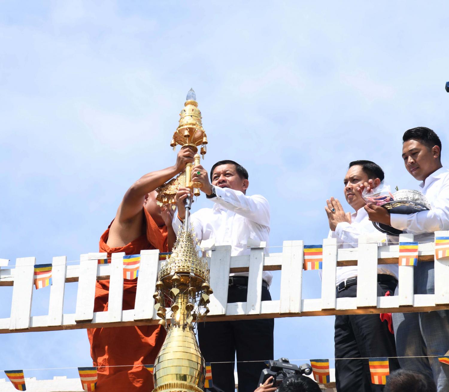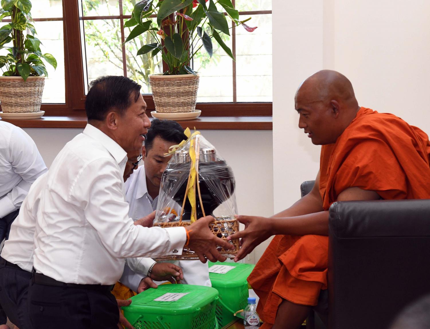 ဆက်လက်၍ နိုင်ငံ တော်စီမံအုပ်ချုပ်ရေးကောင်စီဝင် ဒုတိယဗိုလ်ချုပ်ကြီး မိုးမြင့်ထွန်းနှင့် ကိုယ်စားလှယ်အဖွဲ့ဝင်များက သံဃာတော်အရှင် သူမြတ်များထံသို့ လှူဖွယ်ပစ္စည်းများ ဆက်ကပ် လှူဒါန်းကြသည်။ ယင်းနောက် ကျောင်းထိုင်ဆရာတော် ထံမှ အနုမောဒနာ တရားနာယူကြပြီး လှူဒါန်းမှု အစုစုအတွက် ရေစက်သွန်းချ အမျှပေးဝေခဲ့ကြသည်။