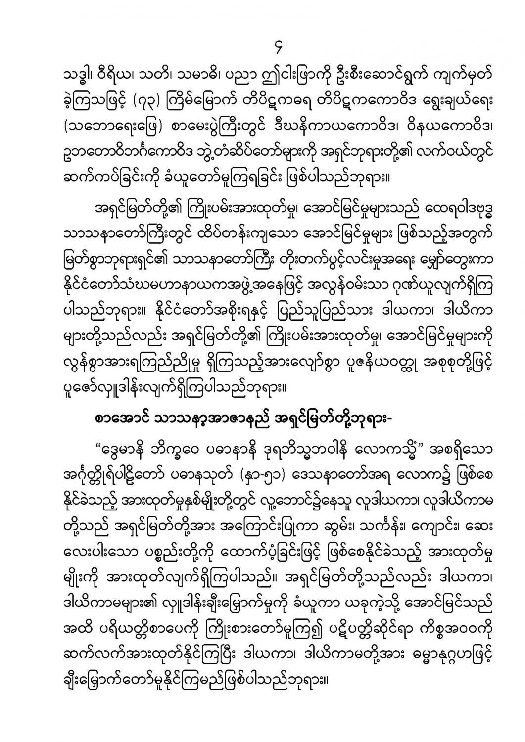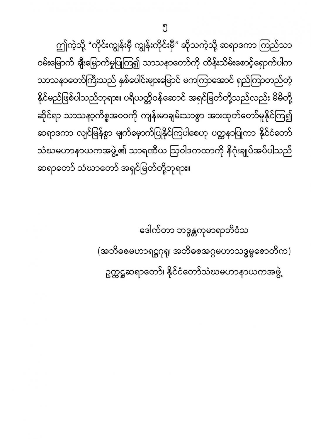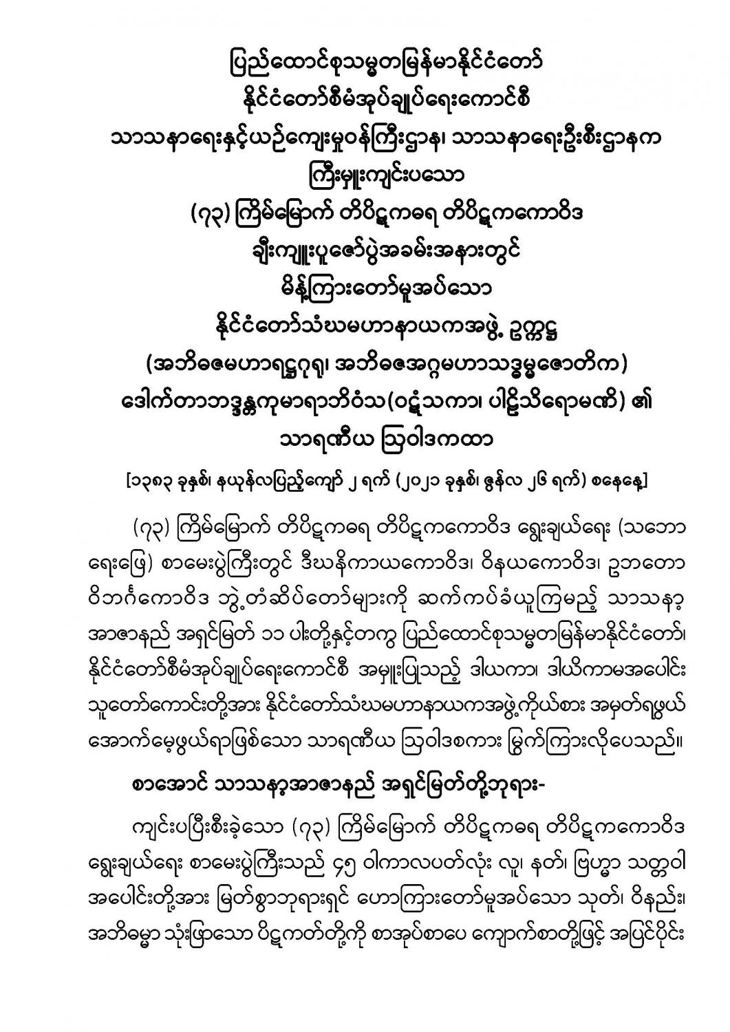 ပြည်ထောင်စုသမ္မတမြန်မာနိုင်ငံတော် နိုင်ငံတော်စီမံအုပ်ချုပ်ရေးကောင်စီ သာသနာရေးနှင့်ယဉ်ကျေးမှုဝန်ကြီးဌာန၊သာသနာရေးဦးစီးဌာနက ကြီးမှူးကျင်းပသော (၇၃)ကြိမ်မြောက် တိပိဋကဓရ တိပိဋကကောဝိဒ ချီးကျူးပူဇော်ပွဲအခမ်းအနားတွင် မိန့်ကြားတော်မူအပ်သော နိုင်ငံတော် သံဃမဟာနာယကအဖွဲ့ ဥက္ကဋ္ဌ ( အဘိဓဇမဟာရဋ္ဌဂုရု၊ အဘိဓဇအဂ္ဂမဟာသဒ္ဓမ္မဇောတိက) ဒေါက်တာ ဘဒ္ဒန္တကုမာရာဘိဝံသ(ဝဋံသကာ၊ပါဠိသိရောမဏိ)၏ သာရဏီယဩဝါဒကထာ { ၁၃၈၃ ခုနှစ်၊ နယုန်လပြည့်ကျော် ၂ ရက်( ၂၀၂၁ ခုနှစ်၊ ဇွန်လ ၂၆ ရက် ) စနေနေ့ }