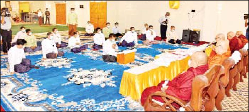 မန္တလေးတိုင်းဒေသကြီး စီမံအုပ်ချုပ်ရေးကောင်စီဥက္ကဋ္ဌ ဦးမောင်ကို မဟာလောကရန်နှိမ် အောင်တော်မူမြတ်စွာဘုရား ပရဝဏ်အတွင်းရှိ သာသနာ့ဗိမာန်ကိစ္စနှင့်ပတ်သက်၍ ဆရာတော် ကြီးများထံမှ သြဝါဒခံယူ