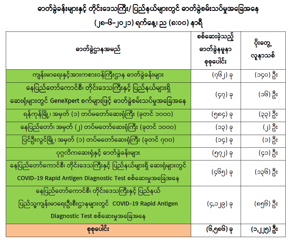 (၂၇-၆-၂၀၂၁) ရက်နေ့၊ ည (၈:၀၀) နာရီမှ (၂၈-၆-၂၀၂၁) ရက်နေ့၊ ည (၈:၀၀) နာရီအတွင်း ဓာတ်ခွဲနမူနာစုစုပေါင်း (၆,၅၈၆) ခုအား စစ်ဆေးပြီးစီးခဲ့ရာ COVID-19 ရောဂါ ဓာတ်ခွဲအတည်ပြု လူနာ သစ် (၁,၂၂၅) ဦး တွေ့ရှိရပါသည်။ သို့ဖြစ်ပါ၍ ယနေ့အထိ ဓာတ်ခွဲနမူနာ စုစုပေါင်း (၂,၇၁၈,၁၇၀) ခု အား စစ်ဆေးခဲ့ပြီး COVID-19 ဓာတ်ခွဲအတည်ပြုလူနာ စုစုပေါင်း (၁၅၄,၃၈၅) ဦး ရှိပြီ ဖြစ်ပါသည်။