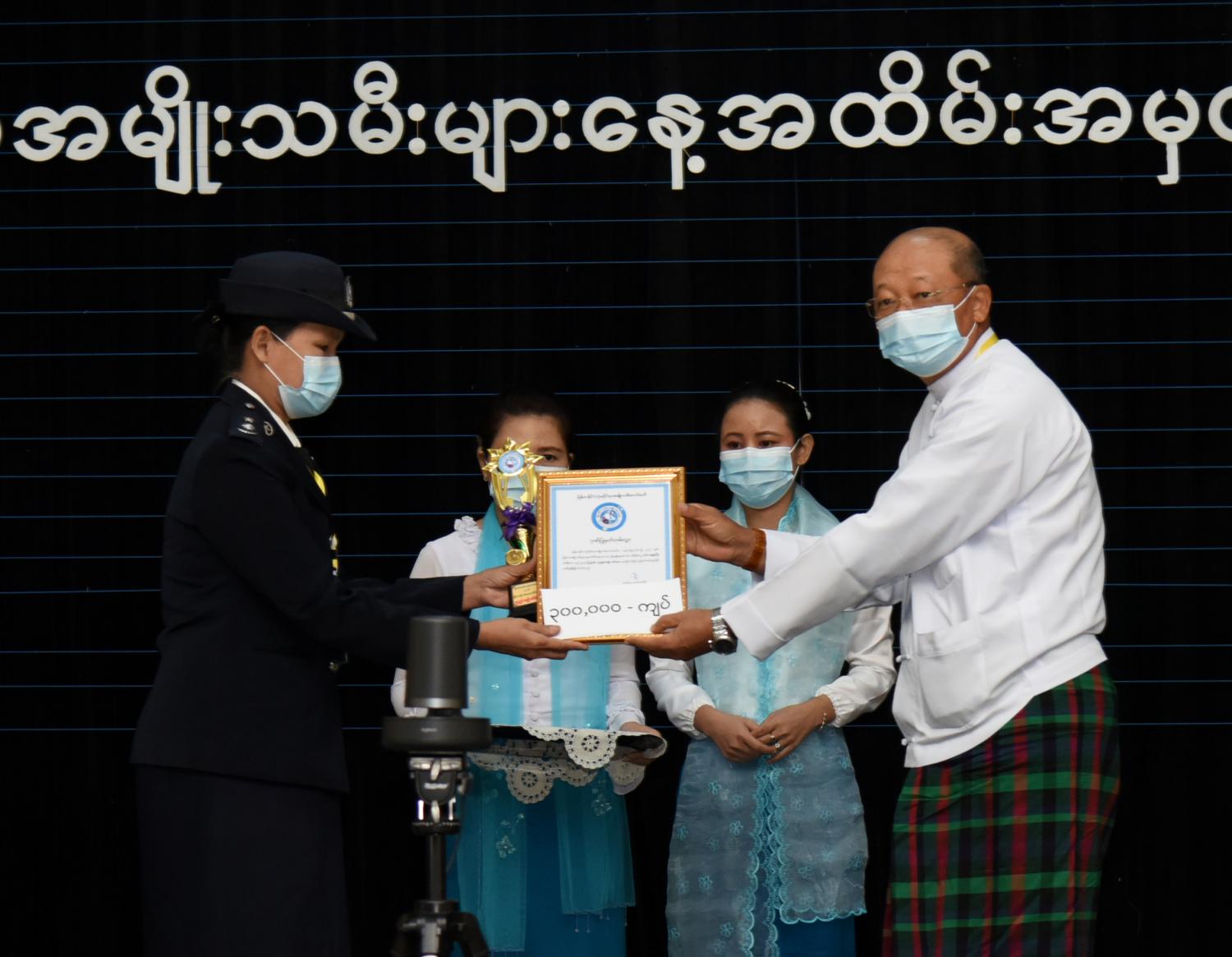 ထို့နောက် ကဏ္ဍအလိုက် ထူးချွန်အမျိုးသမီးများအား ဆုများပေးအပ်ချီးမြှင့်ရာ ကောင်စီ အဖွဲ့ဝင် ဒေါ်အေးနုစိန်က ၂၀၂၀ ပြည့်နှစ်၊ ထူးချွန်အမျိုးသမီးအရာရှိဆုရရှိသူ အမျိုးသမီး ဗိုလ်လောင်း သင်တန်း အမှတ်စဉ်(၇)မှ အကောင်းဆုံးဗိုလ်လောင်းဆုရ ဗိုလ်ဧပရယ်ချို(ရေ-၅၆၁၂) ကို လည်းကောင်း၊ ကောင်စီအဖွဲ့ဝင် Jeng Phang နော်တောင်က ၂၀၂၀ ပြည့်နှစ် ထူးချွန်အမျိုးသမီးရဲမေဆုရ ဒုတိယရဲမှူးကြီး ဝင်းနီလာကိုလည်းကောင်း၊ ကောင်စီအဖွဲ့ဝင် ဦးရွှေကြိမ်းက ထူးချွန်ကြက်ခြေနီ အမျိုးသမီးဆုရရှိသူ ကြက်ခြေနီ မြို့နယ်တပ်ဖွဲ့မှူး ဒေါ်စမ်းစမ်းမော် တို့ကိုလည်းကောင်း ဆုများပေးအပ်ချီးမြှင့်ကြသည်။