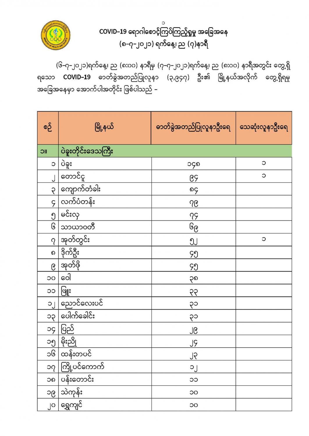 COVID-19 ရောဂါစောင့်ကြပ်ကြည့်ရှုမှု အခြေအနေ (၈-၇-၂၀၂၁) ရက်နေ့၊ ည (၇)နာရီ