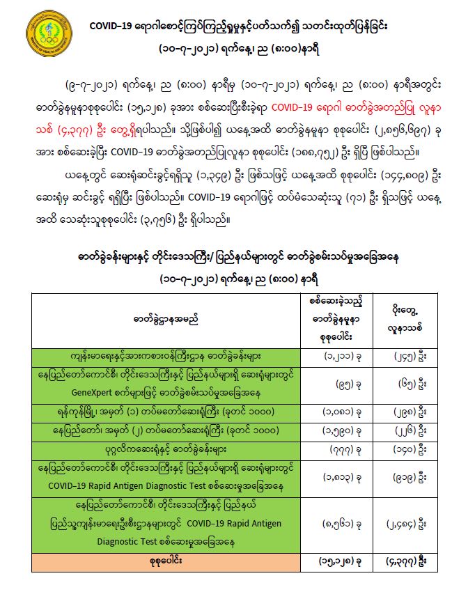 COVID-19 ရောဂါစောင့်ကြပ်ကြည့်ရှုမှုနှင့်ပတ်သက်၍ သတင်းထုတ်ပြန်ခြင်း (၁၀-၇-၂၀၂၁) ရက်နေ့၊ ည (၈:၀၀)နာရီ #Ministry_Of_Health_and_Sports_Myanmar