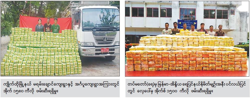 ဒီလိုဆောင်ရွက်ချက်တွေအနက် နိုင်ငံတော် စီမံအုပ်ချုပ်ရေး ကောင်စီလက်ထက်မှာ တိုင်းရင်း သားလက်နက်ကိုင်တွေ ကြီးစိုးနေတဲ့နေရာဒေသ တွေကနေ သယ်ဆောင်လာတဲ့ မူးယစ်ဆေးဝါး ဖမ်းဆီးရမိခဲ့တဲ့ ဖြစ်စဉ်တချို့ကို ကောက်နုတ် ဖော်ပြလိုပါတယ်။
