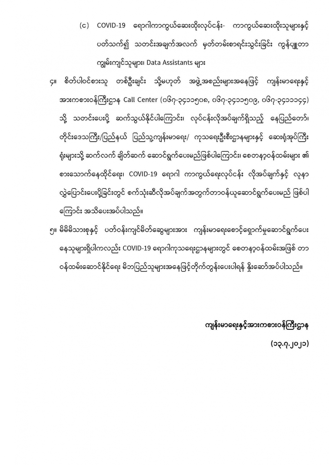 ၅။ မိမိမိသားစုနှင့် ပတ်ဝန်းကျင်မိတ်ဆွေများအား ကျန်းမာရေးစောင့်ရှောက်မှုဆောင်ရွက်ပေး နေသူများရှိပါကလည်း COVID-19 ရောဂါကုသရေးဌာနများတွင် စေတနာ့ဝန်ထမ်းအဖြစ် တာ ဝန်ထမ်းဆောင်နိုင်ရေး မိဘပြည်သူများအနေဖြင့်တိုက်တွန်းပေးပါရန် နှိုးဆော်အပ်ပါသည်။