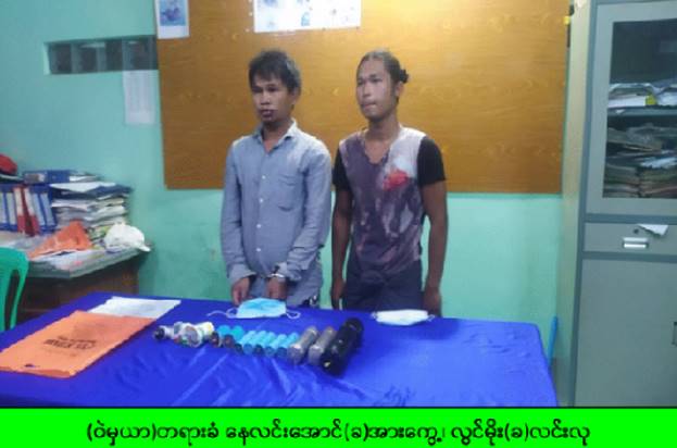 ထိုသို့ဖမ်းဆီးခြင်းများဆောင်ရွက်ခဲ့ရာ ဇူလိုင်လ ၁၂ ရက်နေ့ မွန်းလွဲ ၄ နာရီ အချိန်တွင် မန္တလေးတိုင်းဒေသကြီး၊ ချမ်းအေးသာစံမြို့နယ်၊ ကန်ကောက်ရပ်ကွက်၊ ၅၇ လမ်းနှင့် ၃၄ လမ်းရှိ မြို့နယ်လျှပ်စစ်ရုံးအား လက်လုပ်ဗုံးဖြင့် ပစ်ပေါက်ခဲ့သဖြင့် ဖမ်းဆီးရမိသူ တရားခံ နေလင်းအောင်(ခ)အားကွေ့နှင့် လွင်မိုး(ခ)လင်းလုတို့၏ ထွက်ဆို ချက်အရ ၎င်းတို့နှင့်အတူ မေလအတွင်း အကြမ်းဖက်ဖောက်ခွဲရေးသင်တန်းတက်ရောက်ခဲ့သူ စိုးကြီးနှင့် ထွဋ်ကြီးတို့မှ ပေးအပ် ထားသည့် လက်လုပ်ဗုံးများအား နေလင်းအောင်(ခ)အားကွေ့နေထိုင်သည့် အမရပူရမြို့နယ်၊ မင်းစု ရပ်ကွက်၊ သစ်စက်ဝင်းရှိ နေအိမ်၌ သိမ်းဆည်းထားကြောင်း သတင်းအရ လုံခြုံရေးတပ်ဖွဲ့ဝင်များက သွားရောက်စစ်ဆေးခဲ့ရာ နေအိမ်၏ မြောက်ဘက်ရှိ အမှိုက်ကျင်းအတွင်း သိုဝှက်ထားသည့် PVC ပိုက်၊ သံပိုက်တို့ဖြင့် ပြုလုပ်ထားသော လက်လုပ်ဗုံးမျိုးစုံ ၁၃ လုံး၊ လက်ဆွဲအိတ် ၂ လုံးတို့အား ထပ်မံတွေ့ရှိသိမ်းဆည်း ရမိခဲ့ကြောင်း သိရသည်။