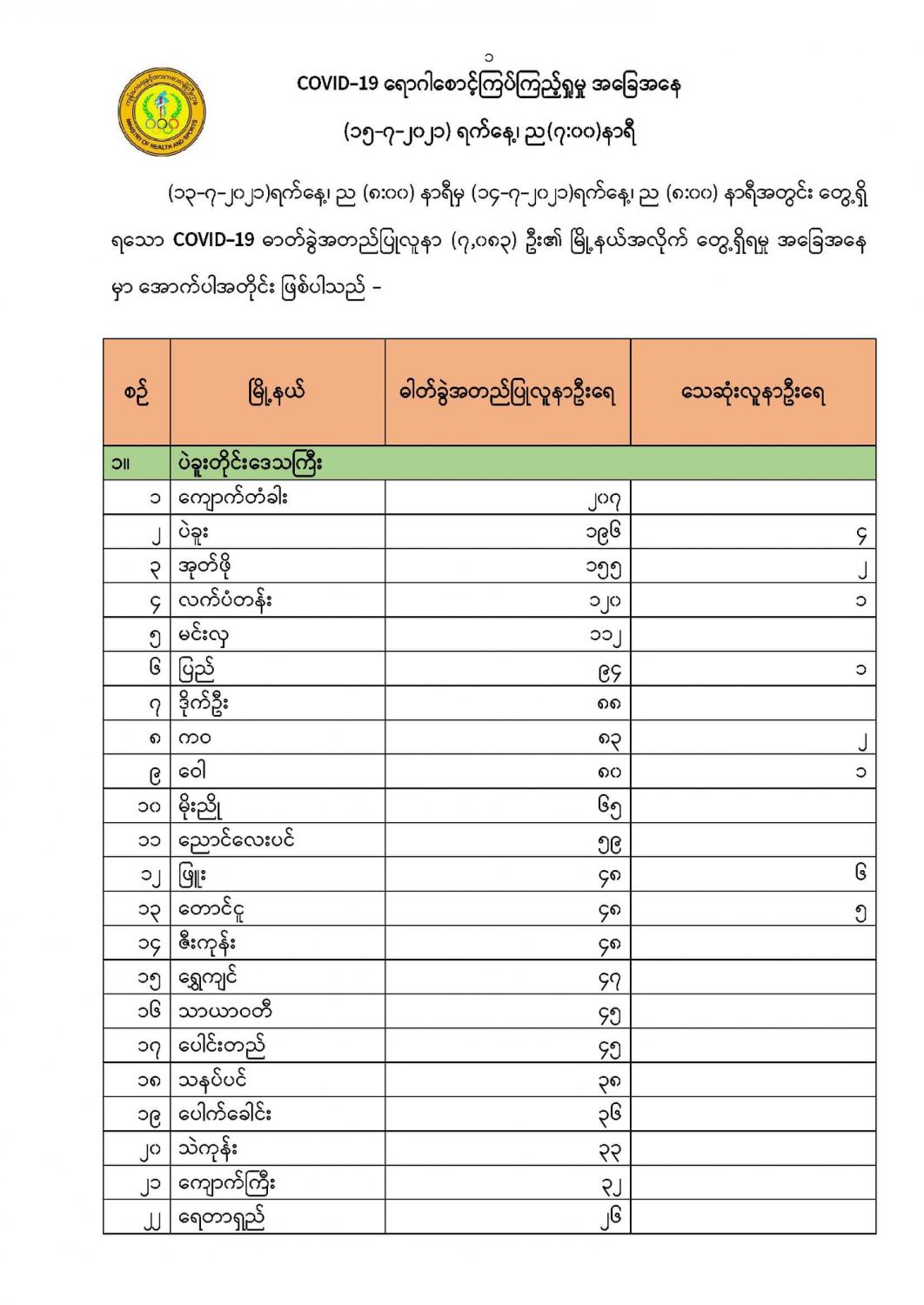 COVID-19 ရောဂါစောင့်ကြပ်ကြည့်ရှုမှု အခြေအနေ (၁၅-၇-၂၀၂၁) ရက်နေ့၊ ည(၇:၀၀)နာရီ 07/15/2021 (၁၃-၇-၂၀၂၁)ရက်နေ့၊ ည (၈:၀၀) နာရီမှ (၁၄-၇-၂၀၂၁)ရက်နေ့၊ ည (၈:၀၀) နာရီအတွင်း တွေ့ရှိ ရသော COVID-19 ဓာတ်ခွဲအတည်ပြုလူနာ (၇,၀၈၃) ဦး၏ မြို့နယ်အလိုက် တွေ့ရှိရမှု အခြေအနေမှာ အောက်ပါအတိုင်း ဖြစ်ပါသည် - #Ministry_of_Health_and_Sports_Myanmar
