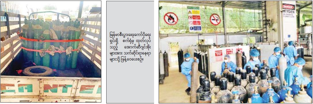 အလားတူ အောက်ဆီဂျင်လိုအပ်ချက်မရှိစေရေးအတွက် မြန်မာစီးပွားရေးကော်ပို ရေးရှင်း၊ မင်းဓမ္မ အောက်ဆီဂျင်ဓာတ်ငွေ့ စက်ရုံမှ တစ်ရက်လျင် အောက်ဆီဂျင် ကုဗပေ ၁၄၉၀၀၀ ကျော်နှင့် မြောင်းတကာ အောက်ဆီဂျင် ဓာတ်ငွေ့စက်ရုံမှ တစ်ရက်လျင် အောက်ဆီဂျင်ကုဗပေ ၁၂၀၀၀၀ ကို နေ့စဉ်ထုတ်လုပ်ဖြန့်ဝေပေးလျက်ရှိပြီး ရန်ကုန်တိုင်း ဒေသကြီးနှင့် ပဲခူးတိုင်း ဒေသကြီး အတွင်းရှိ ပြည်သူ့ဆေးရုံများ၊ တပ်မတော်ဆေးရုံများ၊ ကိုဗစ် စင်တာများသို့ ဖြန့်ဝေ ပေးလျက်ရှိကြောင်း သိရှိရသည်။
