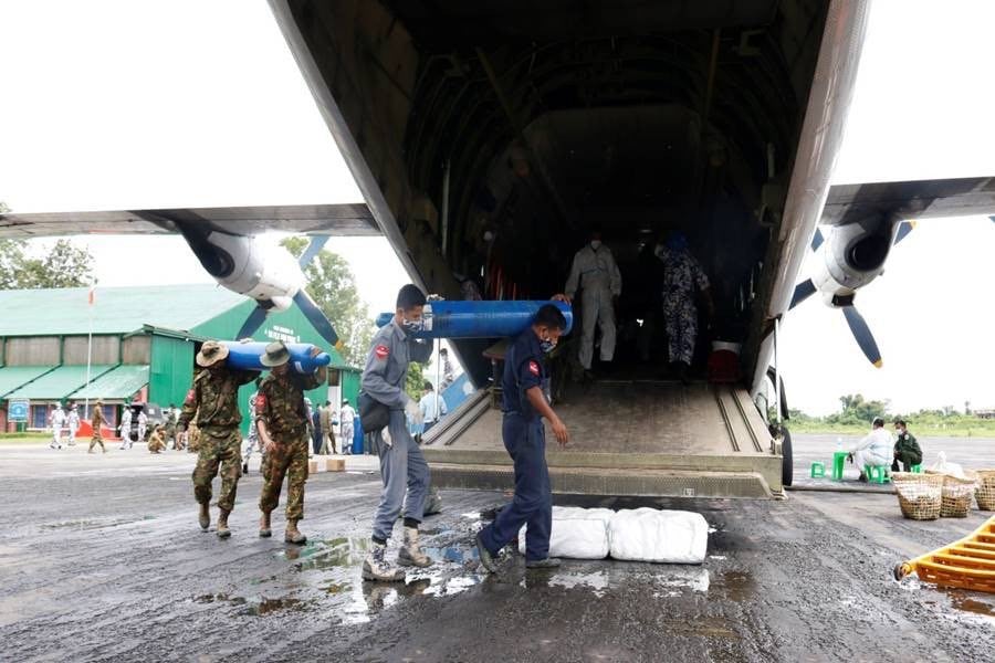 ကိုဗစ်-၁၉ ရောဂါဓာတ်ခွဲအတည်ပြု ပိုးတွေ့လူနာများနှင့် သီးသန့်စောင့်ကြည့်ရမည့်သူများကို ကုသရေးလုပ်ငန်းများ ဆောင်ရွက်ရာတွင် အောက်ဆီဂျင် လိုအပ်ချက်များကို တစ်ဖက်တစ်လမ်းမှ အထောက်အကူပြုစေရန်အတွက် တပ်မတော်နှင့်အလှူရှင်များက အောက်ဆီဂျင်အိုးများကို တိုင်းဒေသကြီးနှင့် ပြည်နယ်အသီးသီးရှိ ပြည်သူ့ဆေးရုံများ၊ တပ်မတော်ဆေးရုံများ၊ ကျန်းမာရေး ဌာနများနှင့် ကိုဗစ်စင်တာများသို့ ပေးပို့လှူဒါန်းလျက်ရှိသည်။