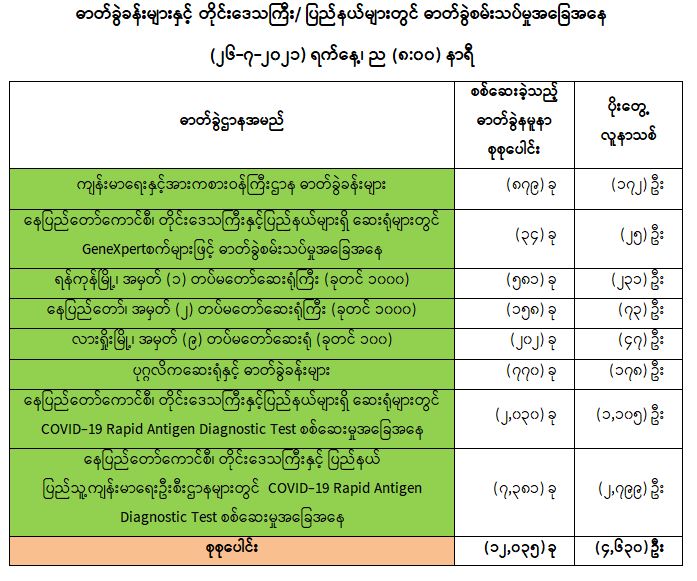 (၂၅-၇-၂၀၂၁)ရက်နေ့၊ ည (၈:၀၀)နာရီမှ (၂၆-၇-၂၀၂၁)ရက်နေ့၊ ည (၈:၀၀)နာရီအတွင်းဓာတ်ခွဲနမူနာစုစုပေါင်း(၁၂,၀၃၅)ခုအားစစ်ဆေးပြီးစီးခဲ့ရာCOVID-19 ရောဂါဓာတ်ခွဲအတည်ပြု လူနာသစ်(၄,၆၃၀)ဦးတွေ့ရှိရပါသည်။ သို့ဖြစ်ပါ၍ ယနေ့အထိ ဓာတ်ခွဲနမူနာစုစုပေါင်း(၃,၀၈၉,၀၃၁)ခုအား စစ်ဆေးခဲ့ပြီး COVID-19 ဓာတ်ခွဲအတည်ပြုလူနာ စုစုပေါင်း (၂၇၄,၁၅၅) ဦး ရှိပြီ ဖြစ်ပါသည်။