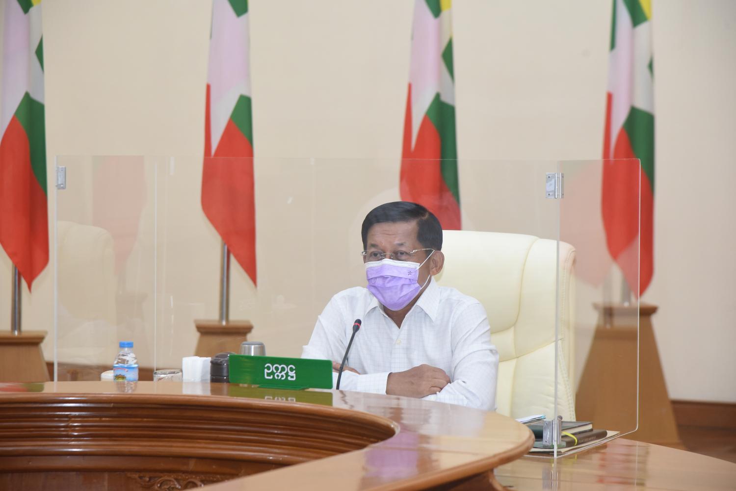 ကိုဗစ် - ၁၉ ရောဂါ ကာကွယ်၊ ထိန်းချုပ်၊ ကုသရေးဆိုင်ရာများတွင် အာဆီယံနိုင်ငံများ၊ မိတ်ဆွေနိုင်ငံများအပါအဝင် နိုင်ငံတကာနှင့် ပူးပေါင်းဆောင်ရွက်မှုများ တိုးမြှင့်လုပ်ဆောင်နိုင်ရေး ညှိနှိုင်းအစည်းအဝေးကို ယနေ့နံနက်ပိုင်းတွင် နေပြည်တော်ရှိ ဘုရင့်နောင်ရိပ်သာ အစည်းအဝေးခန်းမ၌ ကျင်းပပြုလုပ်ရာ နိုင်ငံတော်စီမံအုပ်ချုပ်ရေးကောင်စီ ဥက္ကဋ္ဌ ဗိုလ်ချုပ်မှူးကြီး မင်းအောင်လှိုင် တက်ရောက် အမှာစကားပြောကြားသည်။
