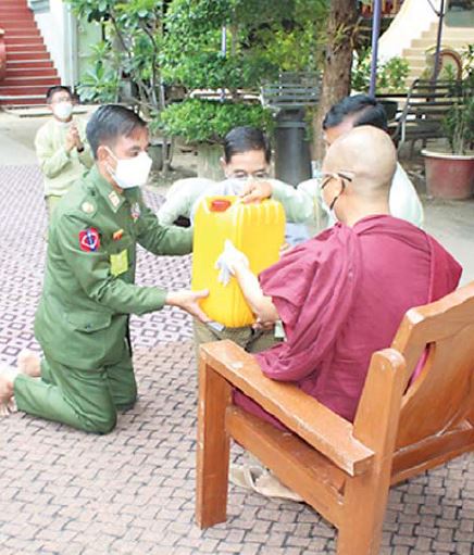 နေပြည်တော် ဇူလိုင် ၂၇ တပ်မတော်(ကြည်း၊ရေ၊လေ) အရာရှိ၊ စစ်သည်၊ အရာထမ်း၊ အမှုထမ်းများက တိုင်းစစ်ဌာနချုပ်များအလိုက် မြို့နယ်အသီးသီးရှိ ဘုန်းတော်ကြီးကျောင်းများ၊ သာ သနာ့နွယ်ဝင် သီလရှင်ကျောင်းများနှင့် ဘာသာရေးကျောင်းများတွင် ဆွမ်းဆန်တော်၊ ဆီ၊ ဆား၊ ပဲ အမယ်(၄)မျိုးနှင့် လှူဖွယ်ပစ္စည်းများလှူဒါန်းခြင်း၊ နေ့ဆွမ်းများ ဆက်ကပ်လှူဒါန်းခြင်းနှင့် ကျန်းမာရေးစစ်ဆေးပေးခြင်းများကို ဆောင်ရွက်လျက်ရှိသည်။ ထိုသို့ ဆောင်ရွက်လျက်ရှိရာ ယနေ့တွင် နေပြည်တော်ကောင်စီနယ်မြေ၊ ပျဉ်းမနားမြို့နယ်ရှိ အုန်းတောကျောင်းတိုက်၊ ဈေးကုန်းကျောင်းတိုက်၊ တပ်ကုန်း မြို့နယ်ရှိ နဝေပုလ္လကျောင်းတိုက်၊ ဇေယျာသီရိမြို့နယ်ရှိ ကန်လယ်ကျောင်းတိုက်၊ စစ်ကိုင်းတိုင်းဒေသကြီး၊ မုံရွာမြို့ရှိ သဒ္ဓမ္မပဇ္ဇောတာရုံကျောင်းတိုက်၊ ဧသုဝတီသီလရှင် စာသင်တိုက်၊ မဟာဇောတိကာရာမပါဠိတက္ကသိုလ်ကျောင်းတိုက်၊ သာသနာရောင်ခြည် ကျောင်းတိုက်၊ သီလဝတီသီလရှင်စာသင်တိုက်နှင့် မန္တလေးတိုင်းဒေသကြီး၊ မန္တလေး မြို့၊ ချမ်းမြသာစည်မြို့နယ်၊ ဒက္ခိဏရာမဘုရားကြီးတိုက်၊ မိတ္ထီလာကျောင်းတို့ရှိ သံဃာတော်များနှင့် သာသနာနွယ်ဝင် သီလရှင်များအား ဆွမ်းဆန်တော်၊ ဆီ၊ ဆား၊ ပဲ အမယ်(၄)မျိုး၊ ကိုဗစ် - ၁၉ ရောဂါ ကာကွယ်ရေး အထောက်အကူပြုပစ္စည်းများနှင့် လှူဖွယ်ပစ္စည်းများကို တိုင်းဒေသကြီးစီမံအုပ်ချုပ်ရေးကောင်စီ ဥက္ကဋ္ဌ၊ သက်ဆိုင်ရာ တိုင်းစစ်ဌာနချုပ်များအလိုက် တိုင်းမှူးများနှင့် တာဝန်ရှိသူများက သွားရောက်၍ ဆက်ကပ်လှူဒါန်းခဲ့ကြကြောင်း သတင်းရရှိသည်။
