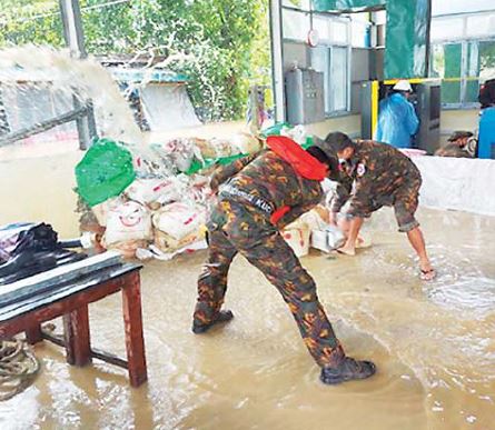 ရခိုင်ပြည်နယ်၊ သံတွဲမြို့နယ်အတွင်း ဇူလိုင် ၂၆ ရက်မှစ၍ မိုးသည်းထန်စွာ ရွာသွန်းပြီး ရခိုင်ရိုးမပေါ်မှ တောင်ကျရေများ ကျဆင်းလာမှုကြောင့် သံတွဲချောင်းရေသည် ၇၀၅ စင်တီမီတာအထိ မြင့်တက်ခဲ့ရာ စိုးရိမ်ရေအမှတ်ထက် ၅၅ စင်တီမီတာ ကျော်လွန်ခဲ့သဖြင့် အဆိုပါမြို့ရှိ အမှတ်(၁)ရပ်ကွက်၊ အမှတ်(၄)ရပ်ကွက်၊ အမှတ်(၇) ရပ်ကွက်နှင့် အံတော်ကျေးရွာများတွင် ရေကျော်ဝင်ရောက်မှုများ ဖြစ်ပေါ် လျက်ရှိရာ အနောက်ပိုင်းတိုင်းစစ်ဌာနချုပ်မှ နယ်မြေခံတပ်မတော်သားများက ရေဘေးလွတ်ရာနေရာ များသို့ ရွှေ့ပြောင်းနေထိုင်နိုင်ရေး လိုအပ်သည့် ကူညီကယ်ဆယ်ရေးလုပ်ငန်းများ သွားရောက် ဆောင်ရွက်ပေးသည်။