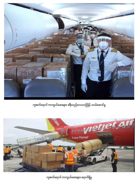 ကိုဗစ်-၁၉ ကာလအတွင်း လေယာဉ်ပြေးဆွဲမှုများကို Stay at home သတ်မှတ်ထားသည့် မြို့များမှအပ ပုံမှန်ပြေးဆွဲနေသည့် ခရီးစဉ်/လမ်းကြောင်းများအတိုင်း ပြေးဆွဲလျက်ရှိပြီး ရုံးပိတ် ရက်ကာလဖြစ်သော ဇူလိုင် ၁၇ ရက်မှ ယနေ့အထိ ပြည်ပသို့ Relief Flight (၁၆၇) ခေါက်၊ ခရီးသည် (၄၆၂၉)ဦး၊ ကုန်စည် (၃၀၃၀၈၇၂)ကီလိုကိုလည်းကောင်း၊ ပြည်တွင်းမြို့များသို့ ခရီးစဉ် (၆၄) ခေါက်၊ ခရီးသည် (၃၇၁၅)ဦးကိုလည်းကောင်း ပျံသန်းပို့ဆောင်ပေးခဲ့သည်။