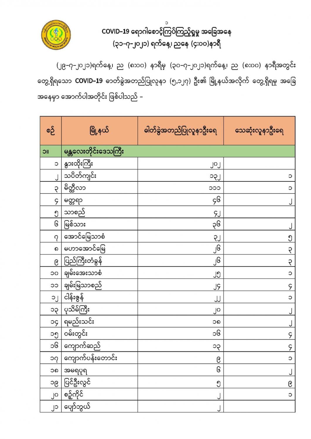 COVID-19 ရောဂါစောင့်ကြပ်ကြည့်ရှုမှု အခြေအနေ (၃၁-၇-၂၀၂၁) ရက်နေ့၊ ညနေ (၄:၀၀)နာရီ 07/31/2021 (၂၉-၇-၂၀၂၁)ရက်နေ့၊ ည (၈:၀၀) နာရီမှ (၃၀-၇-၂၀၂၁)ရက်နေ့၊ ည (၈:၀၀) နာရီအတွင်း တွေ့ရှိရသော COVID-19 ဓာတ်ခွဲအတည်ပြုလူနာ (၅,၁၂၇) ဦး၏ မြို့နယ်အလိုက် တွေ့ရှိရမှု အခြေ အနေမှာ အောက်ပါအတိုင်း ဖြစ်ပါသည် - #Ministry_of_Health_and_Sports_Myanmar