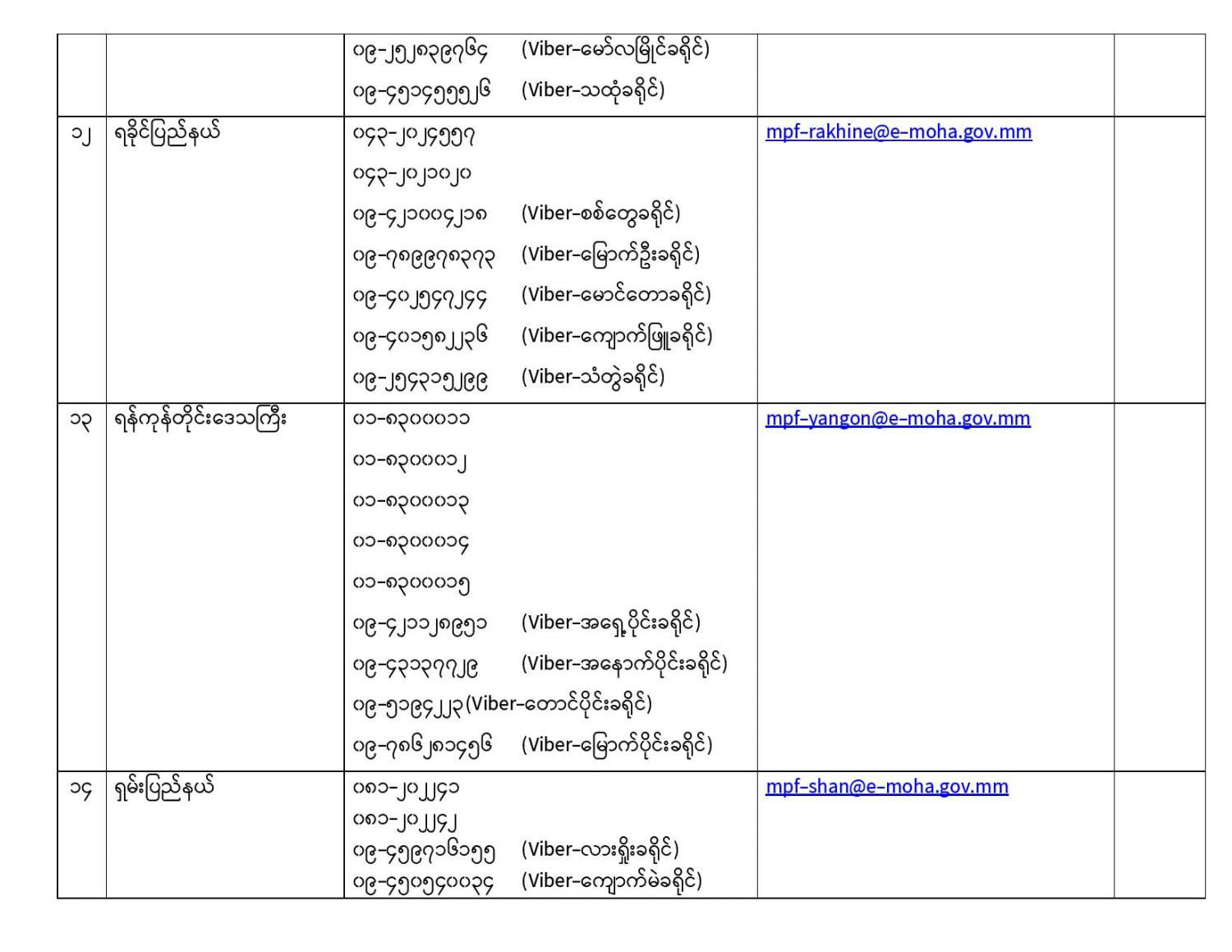 ယခုကာလအတွင်း လူသတ်မှု၊ လုယက်မှု၊ မီးရှို့မှု၊ မိုင်းဖောက်ခွဲမှု၊ လုံခြုံရေးတပ်ဖွဲ့ဝင်များအား ရည်ရွယ်ချက်ရှိရှိ တိုက်ခိုက်မှု၊ ပြည်သူ့ဝန်ထမ်းများနှင့် ပြည်သူအချို့အား အုပ်စုဖွဲ့ ကိုယ်ထိလက်ရောက် တိုက်ခိုက်မှု၊ အစိုးရပိုင်အဆောက်အဦများနှင့် ပုဂ္ဂလိကပိုင် အဆောက်အဦများအား ဖျက်ဆီးမှု၊ (CDM) လှုပ်ရှားမှုတွင် ငွေကြေးအရဖြစ်စေ၊ အခြားနည်းလမ်းဖြစ်ဖြင့်စေ၊ နက်ရှိုင်းစွာကာယကံမြောက် ပါဝင်သူများမှအပ စိုးရိမ်စိတ်ကြောင့် ထွက်ပြေးတိမ်းရှောင်နေကြသည့် ဝန်ထမ်းများ၊ အသိပညာရှင်၊ အတတ်ပညာရှင်များ၊ အခြားနယ်ပယ်အသီးသီးမှ ပုဂ္ဂိုလ်များ၊ နိုင်ငံသားများ အနေဖြင့် ဥပဒေဘောင်အတွင်း ပြန်လည်ဝင်ရောက်မည်ဆိုပါက ၎င်းတို့အပေါ် ရေးဖွင့်ထားသည့် အမှုများကို ဥပဒေနှင့်အညီ ပိတ်သိမ်းခြင်း၊ ရုပ်သိမ်းခြင်းများ ဆောင်ရွက်ပေးမည်ဖြစ်သဖြင့် အောက်တွင် ဖော်ပြထားသည့် ဖုန်းနံပါတ်များသို့ ယုံကြည်စိတ်ချစွာဖြင့် ဆက်သွယ်နိုင်ပါသည်။
