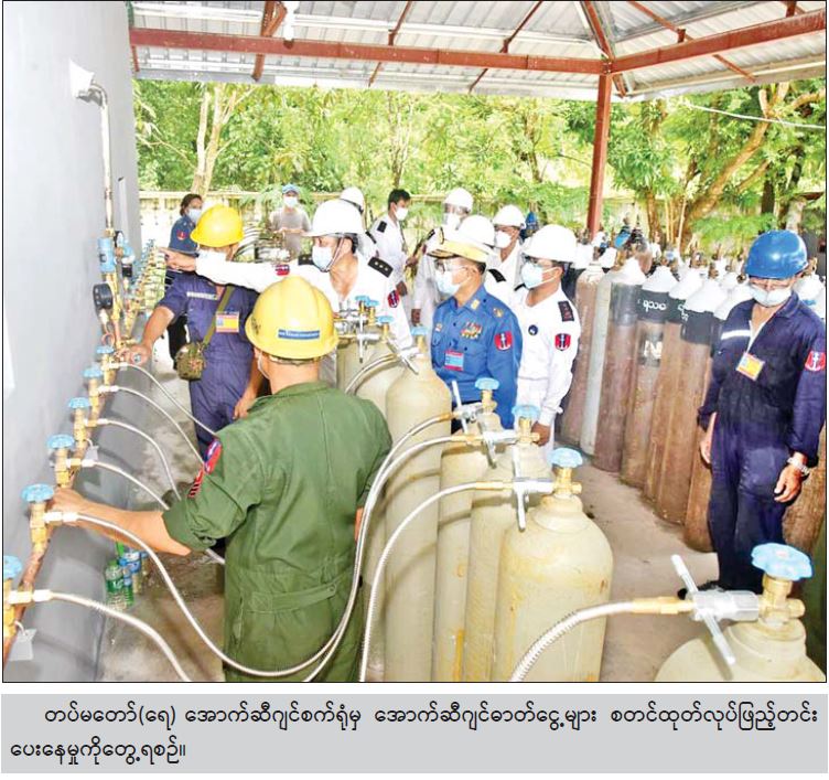 ကိုဗစ်-၁၉ ရောဂါ ကာကွယ်၊ ထိန်းချုပ်၊ ကုသရေးလုပ်ငန်းများအတွက် တပ်မတော်မှ လိုအပ်သော ကူညီထောက်ပံ့လှူဒါန်းမှုများအား စဉ်ဆက်မပြတ် ဆောင်ရွက်ပေးလျက်ရှိရာ အောက်ဆီဂျင်လိုအပ်ချက်များကို ပိုမိုဖြည့်တင်းပေးနိုင်ရန်အတွက် သန်လျင်တပ်နယ်ရှိ ရေတပ်သင်္ဘောကျင်းဌာနချုပ်တွင် KZO-100 အမျိုးအစား Oxygen Plant အား ဇူလိုင်လ ၂၁ ရက်နေ့မှစတင်၍ တပ်မတော်(ရေ)မှ အင်ဂျင်နီယာများဖြင့် တပ်ဆင်စမ်းသပ်မောင်းနှင်ခဲ့ရာ ယနေ့တွင် အောက်စီဂျင် ဓာတ်ငွေ့များ စတင်ထုတ်လုပ် ဖြည့်တင်းပေးနိုင်ခဲ့ပြီဖြစ်ကြောင်း သိရသည်။