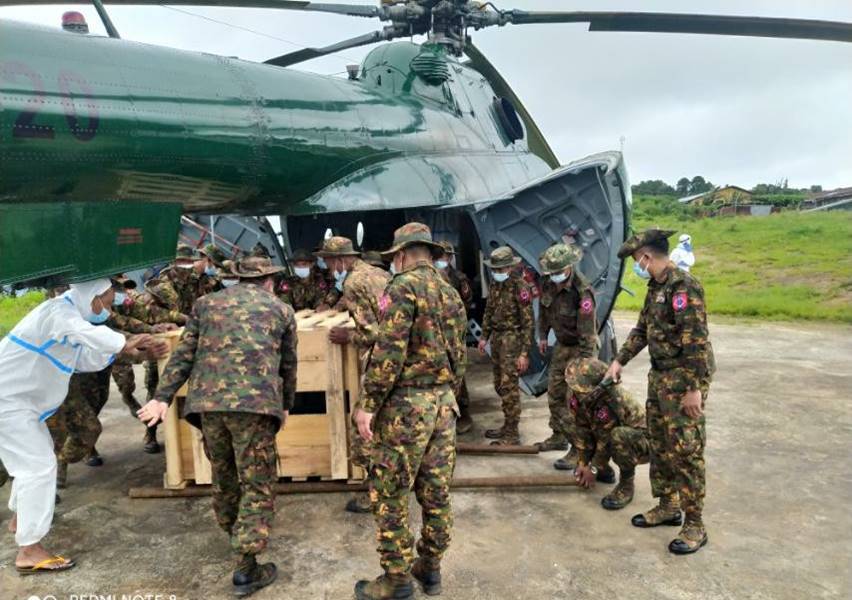 ကိုဗစ်-၁၉ ရောဂါဓာတ်ခွဲအတည်ပြု ပိုးတွေ့လူနာများနှင့် သီးသန့်စောင့် ကြည့်ရမည့်သူများကို ကုသရေးလုပ်ငန်းများ ဆောင်ရွက်ရာတွင် အောက်ဆီဂျင် လိုအပ်ချက်များကို တစ်ဖက်တစ်လမ်းမှ အထောက်အကူပြုစေရန်အတွက် တပ်မတော် နှင့် အလှူရှင်များက အောက်ဆီဂျင်အိုးများ၊ ရောဂါကာကွယ်ရေး အထောက် အကူပြုပစ္စည်းများနှင့် အာဟာရဖြည့်စားသောက်ဖွယ်ရာများကို တိုင်းဒေသကြီးနှင့် ပြည်နယ်အသီးသီးရှိ ပြည်သူ့ဆေးရုံများ၊ တပ်မတော်ဆေးရုံများ၊ ကျန်းမာရေးဌာနများ၊ ကိုဗစ်စင်တာများနှင့် လူမှုကူညီရေး အသင်းအဖွဲ့များသို့ ပေးပို့လှူဒါန်းလျက်ရှိသည်။