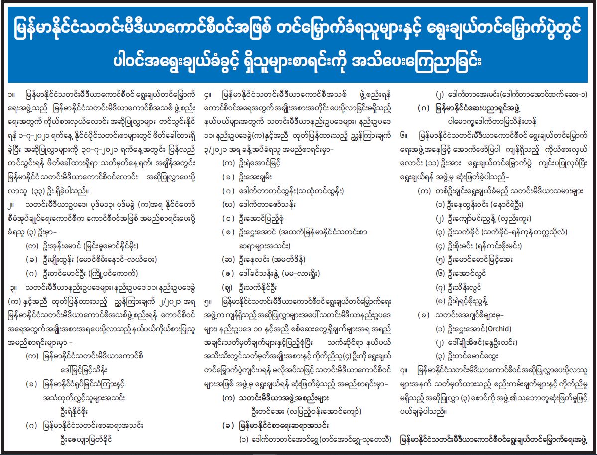 မြန်မာနိုင်ငံသတင်းမီဒီယာကောင်စီဝင်အဖြစ် တင်မြှောက်ခံရသူများနှင့် ရွေးချယ်တင်မြှောက်ပွဲတွင် ပါဝင်အရွေးချယ်ခံခွင့် ရှိသူများစာရင်းကို အသိပေးကြေညာခြင်း 08/15/2021