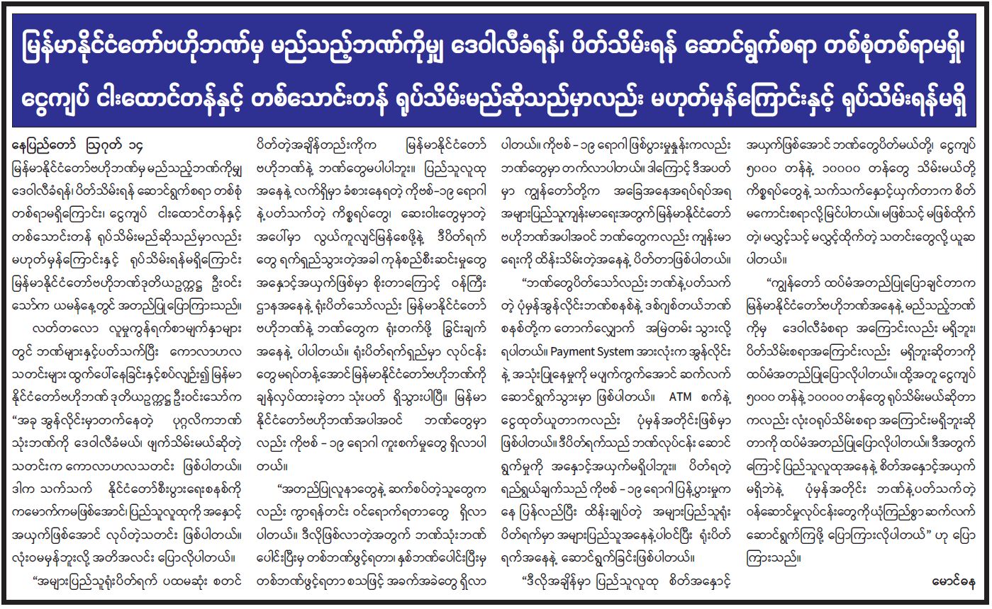မြန်မာနိုင်ငံတော်ဗဟိုဘဏ်မှ မည်သည့်ဘဏ်ကိုမျှ ဒေဝါလီခံရန်၊ ပိတ်သိမ်းရန် ဆောင်ရွက်စရာ တစ်စုံတစ်ရာမရှိ၊ ငွေကျပ် ငါးထောင်တန်နှင့် တစ်သောင်းတန် ရုပ်သိမ်းမည်ဆိုသည်မှာလည်း မဟုတ်မှန်ကြောင်းနှင့် ရုပ်သိမ်းရန်မရှိ 08/15/2021