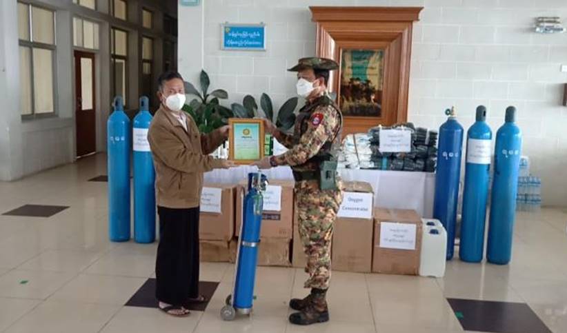 ကိုဗစ်-၁၉ ရောဂါဓာတ်ခွဲအတည်ပြု ပိုးတွေ့လူနာများနှင့် သီးသန့်စောင့် ကြည့်ရမည့်သူများကို ကုသရေးလုပ်ငန်းများ ဆောင်ရွက်ရာတွင် အောက်ဆီဂျင် လိုအပ်ချက်များကို တစ်ဖက်တစ်လမ်းမှ အထောက်အကူပြုစေရန်အတွက် တပ်မတော် နှင့် အလှူရှင်များက အောက်ဆီဂျင်အိုးများ၊ ရောဂါကာကွယ်ရေး အထောက် အကူပြုပစ္စည်းများနှင့် အာဟာရဖြည့်စားသောက်ဖွယ်ရာများကို တိုင်းဒေသကြီးနှင့် ပြည်နယ်အသီးသီးရှိ ပြည်သူ့ဆေးရုံများ၊ တပ်မတော်ဆေးရုံများ၊ ကျန်းမာရေးဌာနများ၊ ကိုဗစ်စင်တာများနှင့် လူမှုကူညီရေး အသင်းအဖွဲ့များသို့ ပေးပို့လှူဒါန်းလျက်ရှိသည်။