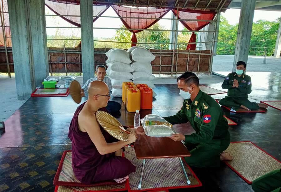 အလားတူ ရန်ကုန်တိုင်းဒေသကြီး၊ သန်လျင်မြို့နယ်၊ ဘုရားကုန်းကျေးရွာရှိ ကျိုက်ဒေးဝကျောင်းတိုက်နှင့် လှည်းကူးမြို့နယ်၊ ဆားတလင်းကျေးရွာရှိ ရှေးဟောင်း တောရဓမ္မဝိယာရကျောင်းတိုက်၊ မန္တလေးတိုင်းဒေသကြီး၊ ချမ်းမြသာစည်မြို့နယ်၊ ဒက္ခိဏရာမဘုရားကြီးတိုက်၊ နယားကျောင်း၊ သပိတ်ကျင်းမြို့နယ်၊ ကျောက်ကြီး ကျေးရွာရှိ မဂ္ဂင်တောရဘုန်းကြီးကျောင်း၊ ပျော်ဘွယ်မြို့နယ်၊ ဝါးရင်းတုတ်ကျေးရွာ ဘုန်းကြီးကျောင်းနှင့် မင်းလှမြို့နယ်၊ မလွန်စာကြောစာသင်တိုက်တို့ရှိ သံဃာတော်များနှင့် သာသနာနွယ်ဝင် သီလရှင်များအား ဆွမ်းဆန်တော်၊ ဆီ၊ ဆား၊ ပဲ အမယ်(၄)မျိုး၊ နေ့ဆွမ်းများ၊ ကိုဗစ်-၁၉ ရောဂါကာကွယ်ရေး အထောက်အကူပြုပစ္စည်းများနှင့် လှူဖွယ်ပစ္စည်းများကို သက်ဆိုင်ရာ တိုင်းစစ်ဌာနချုပ်များမှ နယ်မြေခံတပ်မတော်သားများ၊ ဌာနဆိုင်ရာတာဝန်ရှိသူများက သွားရောက်ဆက်ကပ်လှူဒါန်းပြီး ကျန်းမာရေး စောင့်ရှောက်မှုလုပ်ငန်းများ ဆောင်ရွက်ပေးခဲ့ကြကြောင်း သတင်းရရှိသည်။