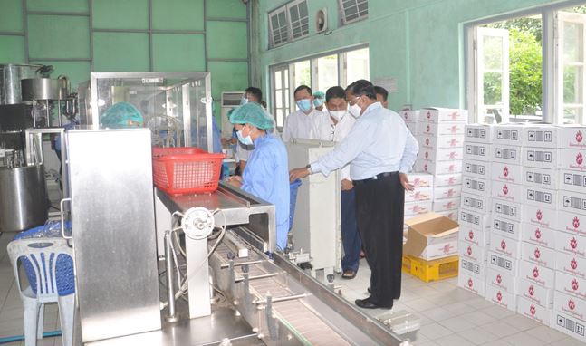 ထို့ကြောင့်စက်ရုံပိုင် မြေကွက်လပ်များတွင် ရာသီဥတုနှင့် ကိုက်ညီသည့် စက်မှုကုန်ကြမ်း သီးနှံများ စိုက်ပျိုးရန်နှင့်မွေးမြူရေးလုပ်ငန်းများကို တွဲဖက်ဆောင်ရွက် ရန်၊ လက်ရှိအချိန်တွင် စက်ရုံ၌ ထုတ်လုပ်လျက်ရှိသည့် အရက်ပြန်များကို ကောင်းမွန်သော ထုတ်လုပ်မှုနည်းစဉ် GMP Guideline များအတိုင်း တိတိကျကျ လိုက်နာဆောင်ရွက်ရန်၊ ကိုဗစ်-၁၉ ရောဂါ ကာကွယ်ရေးလုပ်ငန်းများတွင် အသုံးပြု လျက်ရှိသည့် အရက်ပြန်များကို ယခုထက် ပိုမိုထုတ်လုပ်နိုင်ရေး စီမံဆောင်ရွက်ရန်၊ ထုတ်ကုန်ပစ္စည်းများကို အရည်အသွေး ကောင်းမွန်ပြီး စံချိန်စံညွှန်း ပြည့်မီစွာ ထုတ်လုပ်နိုင်ရေးအတွက် ဝန်ထမ်းများ၏ စွမ်းဆောင်ရည်များကို မြှင့်တင်ပေးရန်၊ စက်ရုံပိုင်မြေ၊ အိမ်ယာ၊ အဆောက်အဦ၊ စက်ပစ္စည်းစသည့် ပုံသေပိုင်ပစ္စည်းများ စီမံခန့်ခွဲမှု အစီအမံများကို အလေးထားဆောင်ရွက်ရန်နှင့် စက်ရုံပိုင်မြေဧရိယာ လုံခြုံရေးစစ်ဆေးကြပ်မတ်ဆောင်ရွက်ရန် လမ်းညွှန်မှာကြားပြီး စက်ရုံအတွင်းရှိ ယခင်ကအချိုမှုန့်နှင့် ကော်မှုန့်ထုတ်လုပ်ခဲ့သည့် စက်ပစ္စည်းများနှင့် အရက်ပြန်များ ထုတ်လုပ်နေမှုတို့ကို လှည့်လည်ကြည့်ရှုစစ်ဆေးသည်။