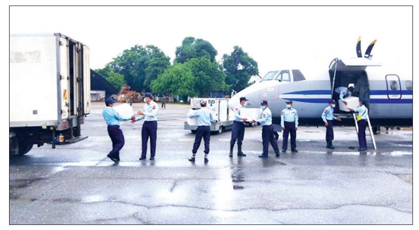 ယင်းသို့ ပေးပို့ဖြန့်ဖြူးပေး သော ကိုဗစ်-၁၉ ကာကွယ်ဆေး များကို ဦးတည်အုပ်စု လူဦးရေ၊ ဦးစားပေးအစီအစဉ်များနှင့်အညီ ပြည်သူများသို့ အမြန်ဆုံးထိုးနှံ ပေးနိုင်ရေးအတွက် ဆောင်ရွက် ခြင်းဖြစ်ပြီး ဝေးလံခက်ခဲသော ဒေသများသို့ တပ်မတော်(လေ)မှ ပို့ဆောင်ရေးလေယာဉ်၊ ရဟတ်ယာဉ်များ၊ မြန်မာ့လေကြောင်း တို့၏ အကူအညီများ ရယူကာ လေကြောင်း ခရီးဖြင့်လည်း ဆက်လက် ဖြန့်ဖြူးပေးလျက်ရှိ ကြောင်း သတင်းရရှိသည်။