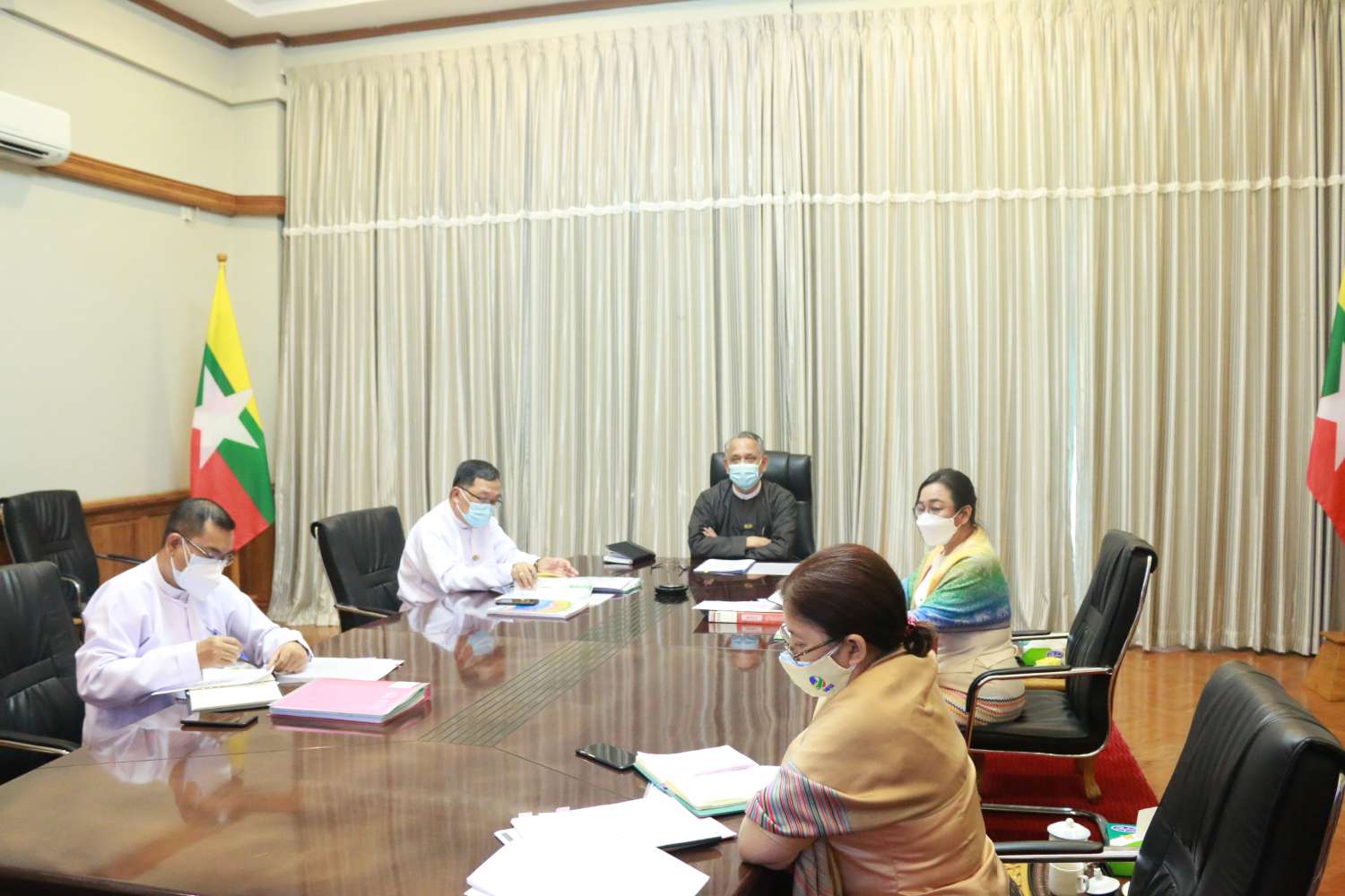 အစည်းအဝေးသို့ ကိုဗစ်-၁၉ ကြောင့် ဖြစ်ပေါ်လာသည့် စီးပွားရေးသက်ရောက်မှုများ အပေါ် ကုစားရေးလုပ်ငန်းကော်မတီ ဥက္ကဋ္ဌ၊ ရင်းနှီးမြှုပ်နှံမှုနှင့် နိုင်ငံခြားစီးပွားဆက်သွယ်ရေးဝန်ကြီးဌာန ပြည်ထောင်စုဝန်ကြီး ဦးအောင်နိုင်ဦး၊ ရင်းနှီးမြှုပ်နှံမှုနှင့် နိုင်ငံခြားစီးပွားဆက်သွယ်ရေးဝန်ကြီးဌာန ဒုတိယဝန်ကြီး ဦးသန်းအောင်ကျော်၊ လုပ်ငန်းကော်မတီ အတွင်းရေးမှူး၊ ရင်းနှီးမြှုပ်နှံမှုနှင့် နိုင်ငံခြားစီးပွားဆက်သွယ်ရေးဝန်ကြီးဌာန၊ ညွှန်ကြားရေးမှူးချုပ် ဒေါက်တာ ဝါဝါမောင်နှင့် ပြည်ထောင်စုသမ္မတမြန်မာနိုင်ငံ ကုန်သည်များနှင့် စက်မှုလက်မှုလုပ်ငန်းရှင်များ အသင်းချုပ်မှ တာဝန်ရှိသူများ တက်ရောက်ကြသည်။