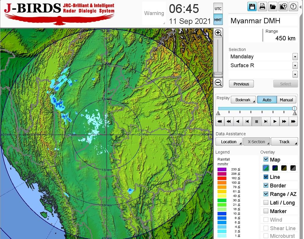 မန္တလေးမြို့နှင့် အနီးတစ်ဝိုက်အတွက် ယနေ့ညနေအထိ ခန့်မှန်းချက်။ နေရာကွက်ကျား မိုးထစ်ချုန်းရွာမည်။ ရွာရန်ရာနှုန်းပြည့် ဖြစ်ပါသည်။