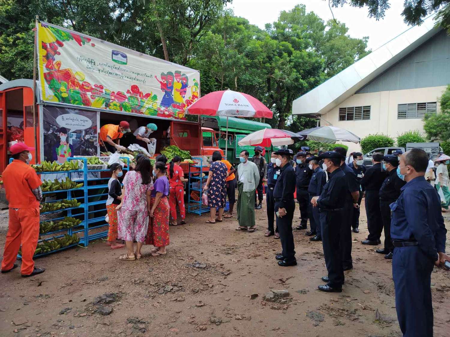 ရှေးဦးစွာ မြို့တော်ဝန်နှင့်အဖွဲ့သည် နံနက် ၇ နာရီတွင် မင်္ဂလာတောင်ညွန့်မြို့နယ် စက်ရုံလမ်းရှိ မအူကုန်းစည်ပင်ဝန် ထမ်းအိမ်ရာ ဝင်း၌ ရွေ့လျားဈေးကား (Mobile Market) စနစ်ဖြင့် ကုန်စိမ်း၊ ကုန်ခြောက်မျိုးစုံ၊ အသားမျိုးစုံနှင့် ငါး/ပုဇွန် အမျိုးမျိုးတို့ ရောင်းချ နေမှုအား သွားရောက်ကြည့်ရှုစစ်ဆေးသည်။