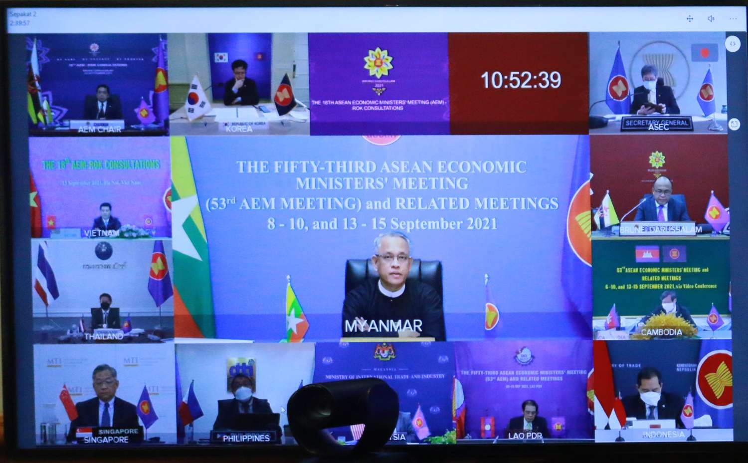 ဆက်လက်၍ (၂၄) ကြိမ်မြောက် အာဆီယံအပေါင်းသုံး စီးပွားရေးဝန်ကြီးများ အစည်းအဝေးကို ကျင်းပရာ ဘရူနိုင်းနိုင်ငံ ဝန်ကြီးချုပ်ရုံး ဝန်ကြီးနှင့် ဘဏ္ဍာရေးနှင့် စီးပွားရေး ဝန်ကြီး H.E. Dato Dr. Amin Liew Abdullah ၊ တရုတ်နိုင်ငံ စီးပွားရေးနှင့် ကူးသန်းရောင်းဝယ် ရေးဝန်ကြီး H.E. Wentao Wang၊ ဂျပန်နိုင်ငံ စီးပွားရေး၊ ကုန်သွယ်ရေး နှင့် စက်မှုဝန်ကြီးဌာန ဝန်ကြီး H.E. Hiroshi Kajiyama နှင့် ကိုရီးယားသမ္မတနိုင်ငံ ကုန်သွယ်ရေး၊ စက်မှုနှင့် စွမ်းအင် ဒုတိယဝန်ကြီး H.E. Dr. Yoonjong Chun တို့က ပူးတွဲသဘာပတိများအဖြစ် ဆောင်ရွက်ကြပြီး အာဆီယံအပေါင်းသုံး စီးပွားရေးပူးပေါင်း ဆောင်ရွက်မှု လုပ်ငန်းအစီအစဉ် (၂၀၂၁-၂၀၂၂) အပေါ် ဝန်ကြီးများက ဆွေးနွေးအတည်ပြုကြ၍ ကိုဗစ်-၁၉ ကူးစက်ရောဂါကြောင့် စီးပွားရေး ထိခိုက်မှု များ လျော့နည်းစေရေး အာဆီယံအပေါင်းသုံး လုပ်ငန်းစီမံချက်၏ ဖြစ်ပေါ် တိုးတက်မှုများကို မှတ်တမ်းတင်ခဲ့သည်။
