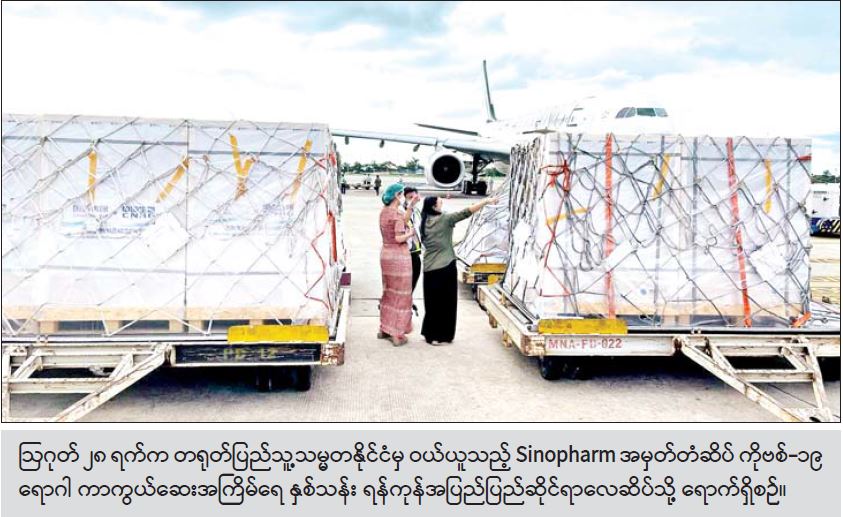ဩဂုတ်လ၈ရက်က တရုတ်ပြည်သူ့သမ္မတနိုင်ငံကနေ ဝယ်ယူထားတဲ့ ကိုဗစ်-၁၉ ရောဂါ ကာကွယ် ဆေးတစ်သန်းရောက်ရှိလာခဲ့သလို တရုတ်ပြည်သူ့ လွတ်မြောက်ရေး တပ်မတော်နဲ့ ပေကျင်းမြို့မှာရှိတဲ့ မြန်မာသံရုံး၊ စစ်သံရုံးတို့ကလှူဒါန်းတဲ့ ကာကွယ် ဆေးတွေနဲ့ဆေးဘက် ဆိုင်ရာ အထောက်အကူပစ္စည်းတွေ ဩဂုတ်လ၂၂ရက်က ရန်ကုန်အပြည်ပြည်ဆိုင်ရာ လေဆိပ် ကိုလည်းကောင်း၊ တရုတ်နိုင်ငံမှ ဝယ်ယူ ထားတဲ့ကာကွယ်ဆေး နှစ်သန်းမှာ ဩဂုတ်လ ၂၈ ရက်ကလည်းကောင်း ရောက်ရှိလာခဲ့ပါတယ်။