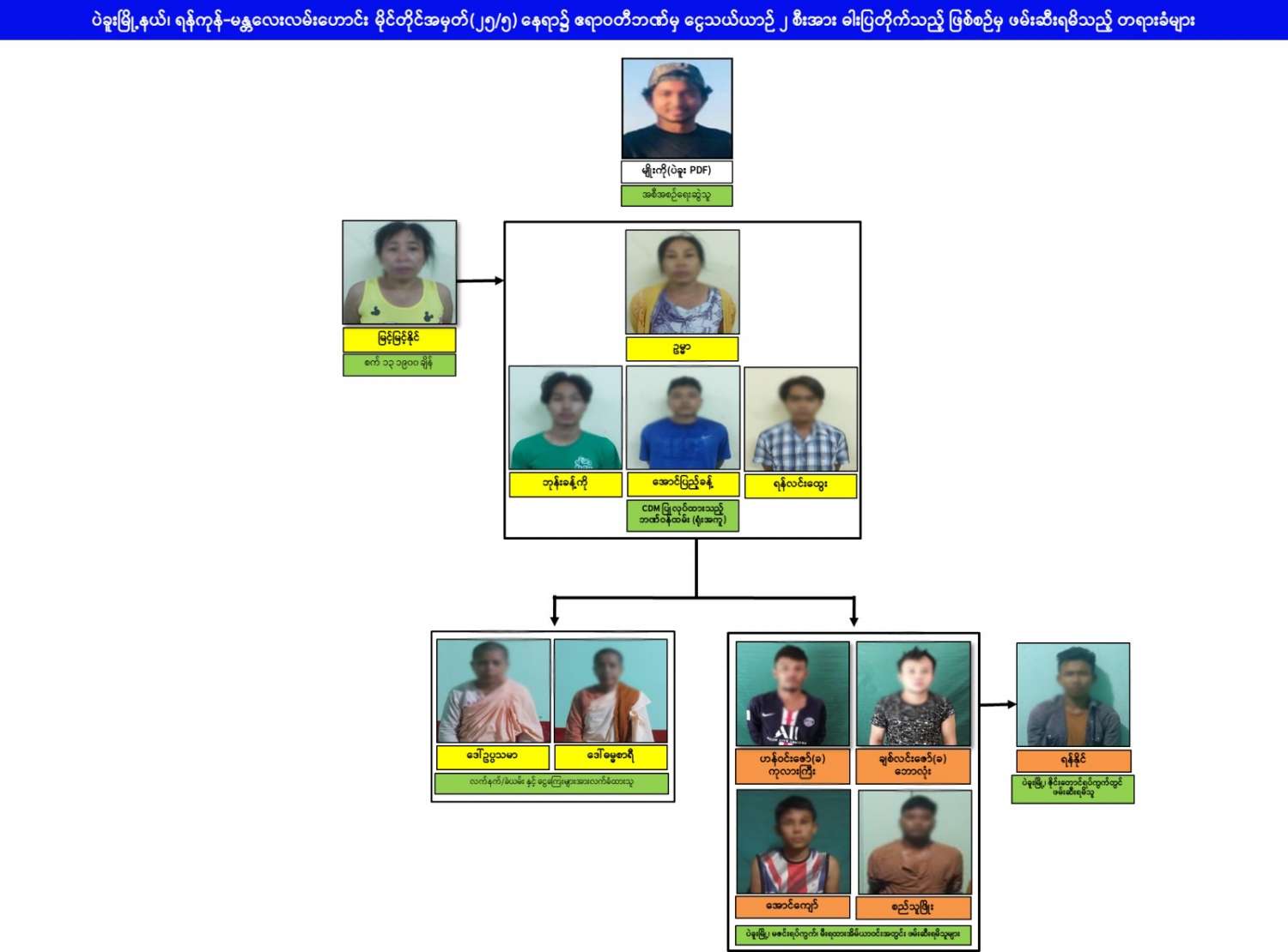 ဖမ်းဆီးရမိတရားခံများ၏ ထွက်ဆိုချက်များအရ ပဲခူးမြို့၊ မဇင်းရပ်ကွက်၊ မီးရထားအိမ်ယာဝန်း အတွင်း နေအိမ်တစ်လုံးအတွင်း၌ ဆက်စပ်တရားခံများ ရောက်ရှိနေကြောင်း သိရှိရသဖြင့် ယနေ့မွန်းလွဲ ၁ နာရီ ၂၅ မိနစ်တွင် ဝင်ရောက် ရှာဖွေခဲ့ရာ ဟန်ဇော်ဝင်း (ခ) ကုလားကြီး (ဘ) ဦးမောင်မောင်စန်း၊ ချစ်လင်းဇော် (ခ) ဘောလုံး (ဘ) ဦးသိန်းဇော်၊ အောင်ကျော် (ဘ) ဦးသက်ဦးနိုင်နှင့် စည်သူဖြိုး (ဘ) ဦးသန်းဌေး တို့အား ငွေကျပ် (၁၀) သိန်း ၊ လက်ပစ်ဗုံး ၁ လုံးနှင့်အတူ ဖမ်းဆီးရမိခဲ့ပြီး မွန်းလွဲ ၂ နာရီခွဲတွင် ပဲခူးမြို့နယ်၊ ရန်ကုန် - မန္တလေး လမ်းဟောင်းဘေး၊ ဇိုင်းတောင်ရပ်ကွက် “ကောင်းကြိုက်”ဒန်ပေါက်ဆိုင်ရှေ့တွင် ဆက်စပ် တရားခံ ရန်နိုင် (ဘ) ဦးစိုးရွှေ အား ထပ်မံဖမ်းဆီးရမိခဲ့သည်။