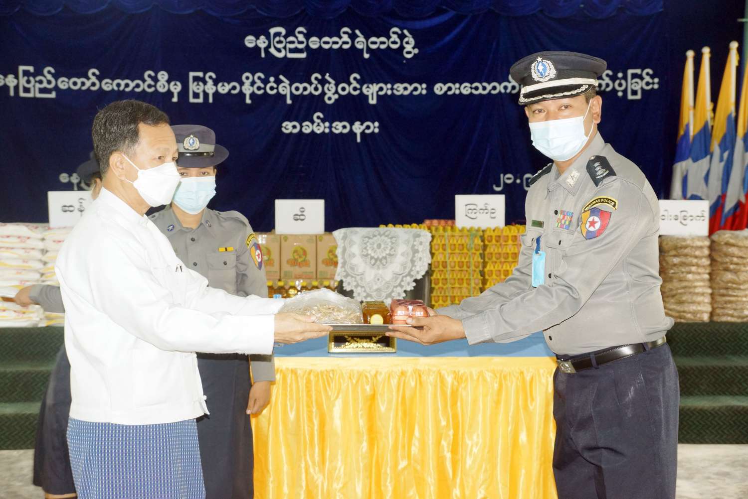 နေပြည်တော်ကောင်စီမှ ကိုဗစ်- ၁၉ရောဂါ တားဆီးကာကွယ်ရေးလုပ်ငန်းများကို စွမ်းစွမ်းတမံ ပါဝင်ဆောင်ရွက်ခဲ့ကြ သည့် မြန်မာနိုင်ငံရဲတပ်ဖွဲ့ဝင်များကို စားသောက်ကုန်များထောက်ပံ့