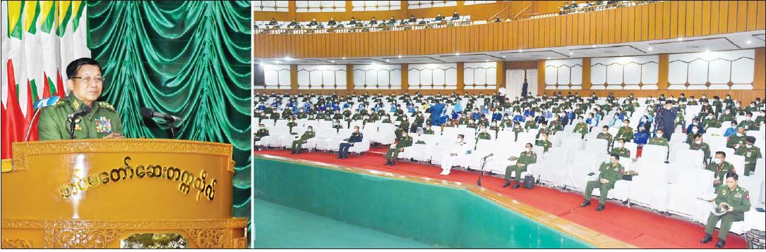 ထို့နောက် မြန်မာနိုင်ငံ၏ နိုင်ငံရေးဖြစ်ပေါ်ပြောင်းလဲမှု အခြေအနေများနှင့် ပတ်သက်၍ မိမိတို့နိုင်ငံသည် ၂၀၁၁ ခုနှစ်တွင်ပြည်သူများလိုလားသည့် ပါတီစုံဒီမိုက ရေစီလမ်းကြောင်းပေါ်တွင် ဖွဲ့စည်းပုံအခြေခံဥပဒေ(၂၀၀၈)ခုနှစ် နှင့်အညီ လျှောက် လှမ်းခဲ့ကြောင်း၊ ဖွဲ့စည်းပုံအခြေခံဥပဒေ(၂၀၀၈)ခုနှစ်သည် ပြည်သူများမှ ဆန္ဒမဲ ပေးခွင့်ရှိသူများ၏ ၉၂ ဒသမ ၄ ရာခိုင်နှုန်းဖြင့် အတည်ပြုခဲ့ခြင်းဖြစ်သဖြင့် မျက်ကွယ် ပြုနေ၍မရကြောင်း၊ ၂၀၁၁ ခုနှစ်နှင့် ၂၀၁၅ ခုနှစ် ဒီမိုကရေစီအစိုးရသက်တမ်းများတွင် တပ်မတော်အနေဖြင့် ဥပဒေအရပေးအပ်ထား သောတာဝန် များကို အစိုးရနှင့်အတူ ပူးပေါင်းဆောင်ရွက်ပေးခဲ့ကြောင်း၊ ၂၀၁၈ ခုနှစ်မှစ၍ အနိုင်ရပါတီ၏ လုပ်ဆောင်ချက် များသည် ဥပဒေနှင့်ညီညွတ်ခြင်းမရှိသည်ကို တွေ့ရှိရသဖြင့် မိမိအနေဖြင့် ဒီမိုကရေစီ တွင် စည်းကမ်းတကျ ရှိရန်နှင့် တရားမျှတမှုရှိရန်အကြိမ်ကြိမ်တိုက် တွန်းပြောကြားခဲ့ ကြောင်း၊ သို့သော် ရွေးကောက်ပွဲ ကျင်းပရာ၌ ကြိုတင်မဲပေးခြင်းများဆောင်ရွက်ရာတွင် ဥပဒေနှင့်ညီညွတ်မှုများမရှိသည်ကို သိရှိခဲ့ရပြီး ရွေးကောက်ပွဲကျင်း ပချိန်တွင်လည်း မဲစာရင်းမှားယွင်းမှုများဖြစ်ပေါ်ခဲ့သည်ကို အချို့သောပုဂ္ဂိုလ်များနှင့် နိုင်ငံရေး ပါတီများ၏ ပြောကြားချက်အရသိရှိခဲ့ရကြောင်း၊ မဲစာရင်းများအား ပြန်လည်စိစစ်ခဲ့ရာ မဲစာရင်း မှားယွင်းမှုကို တွေ့ ရှိရသဖြင့် အစိုးရအဖွဲ့နှင့် ရွေးကောက်ပွဲကော်မရှင်မှ တာဝန်ရှိသူများ အား မဲစာရင်းမှား ယွင်းမှုများအတွက် ဖြေရှင်းပေးရန် အကြိမ်ကြိမ်ပြောကြားခဲ့ကြောင်း၊ တပ်မတော်အနေဖြင့် တာဝန်ရှိသူများနှင့် အကြိမ်ကြိမ်တွေ့ ဆုံညှိနှိုင်း ခဲ့သော်လည်း ဖြေရှင်းပေး ခြင်းမရှိသဖြင့် ဖွဲ့စည်းပုံအခြေခံ ဥပဒေ(၂၀၀၈ ခုနှစ်)နှင့်အညီ နိုင်ငံတော် အား အရေးပေါ်အခြေအနေကြေညာ၍ တာဝန်ယူဆောင်ရွက်ခဲ့ရခြင်းဖြစ်ကြောင်း။
